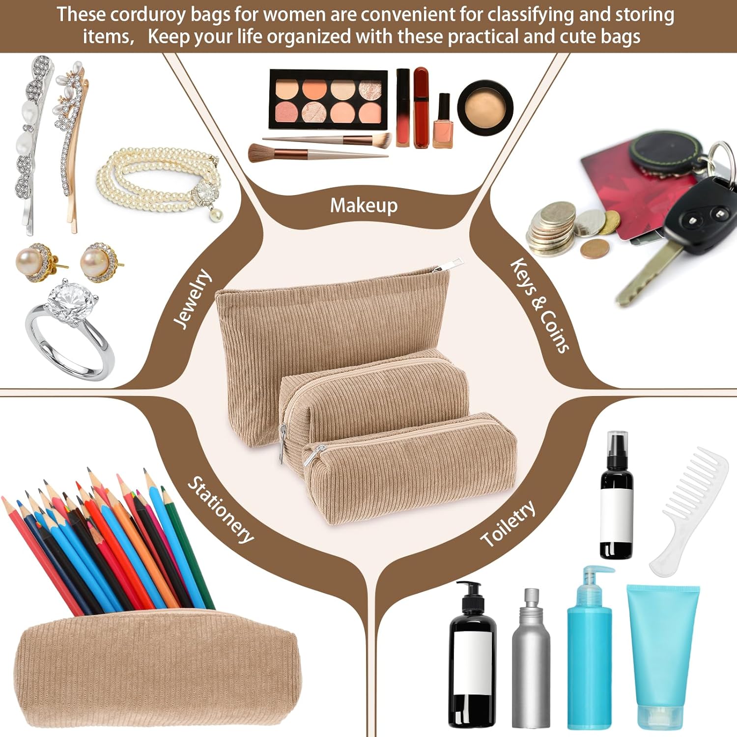3 Pcs Makeup Bag Set for Women Corduroy Cosmetic Pouch Aesthetic Smile Travel Toiletry Bag Cute Purse Pouch Pencil Case Makeup Brushes Storage Organizer for Christmas(Khaki,Solid Style)