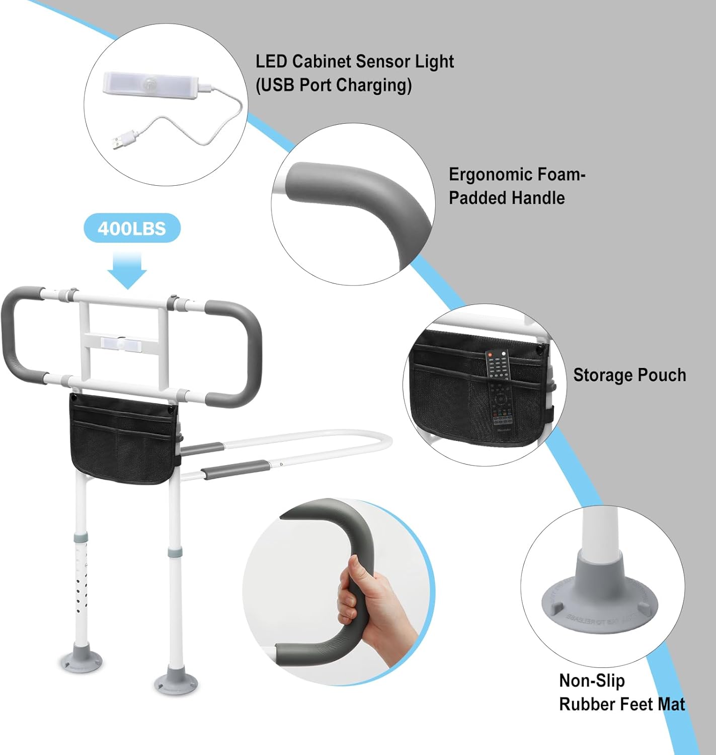- Night-Time Safety: To prevent dangerous falls, our bed rail includes a sturdy safety LED motion sensor light secured to it. The sensor light automatically activates when moved, increasing safety when using the toilet at night