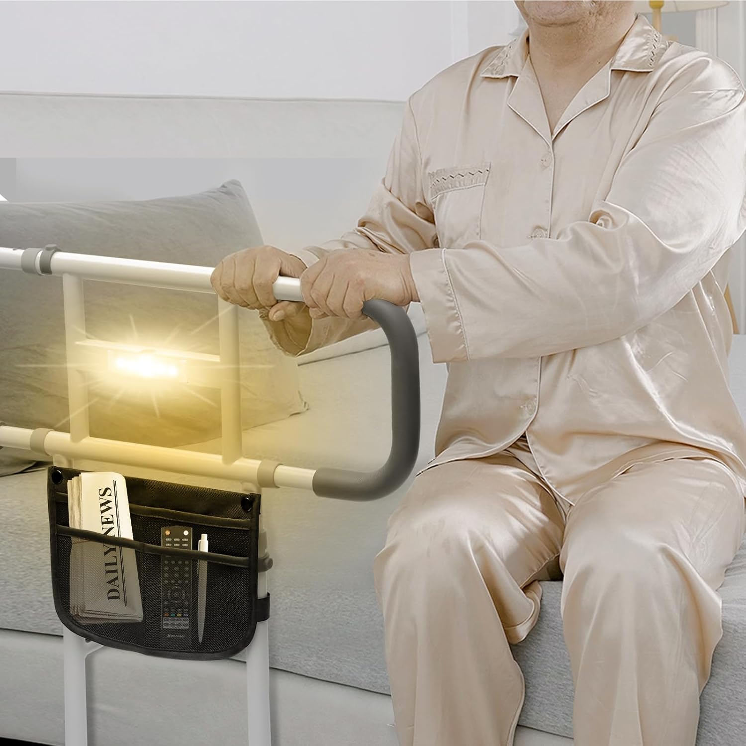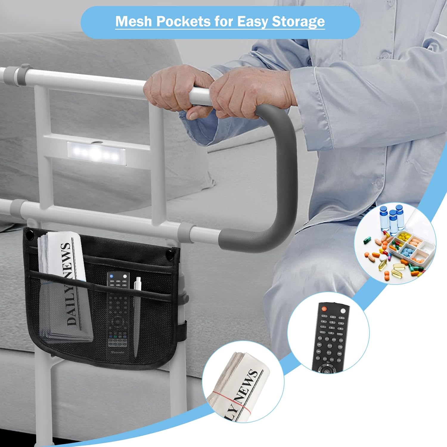 - Portable Bed Rails: Our bed assist rails for seniors include a high-quality, lightweight, durable bag designed to perfectly store your glasses, TV remote, medications, or magazines. A portable bed rail can let you bring it to the places you want and support your daily use