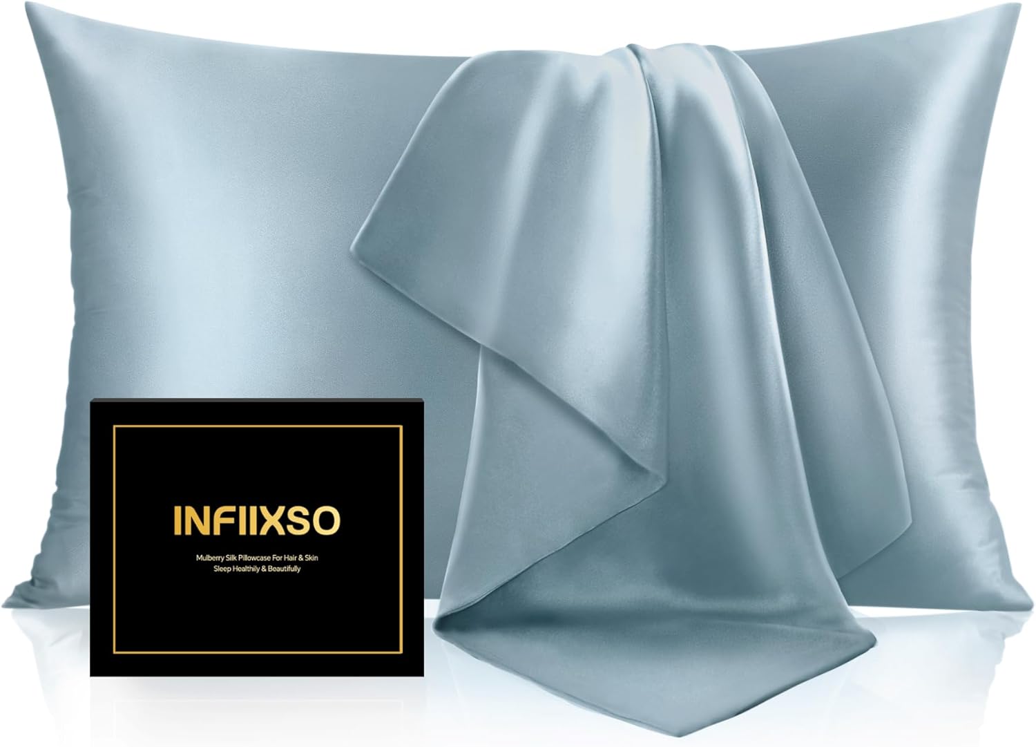 INFIIXSO Mulberry Silk Pillowcase for Hair and Skin, Silk Pillow Cases Queen Size Set of 2 with Hidden Zipper 20"x30", Ultra Smooth and Soft Cooling Pillow Cases for Hot Sleepers(Airy Blue, 2 Pack)