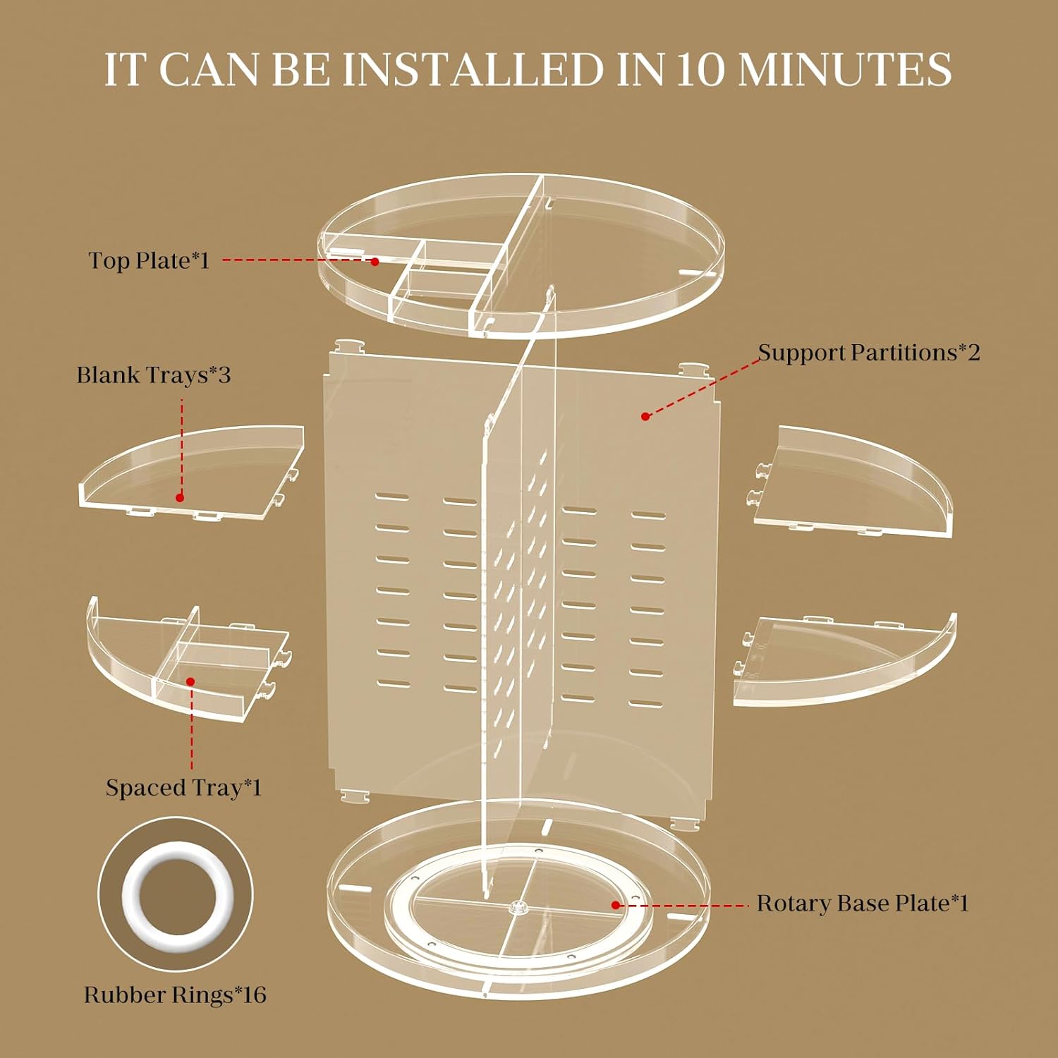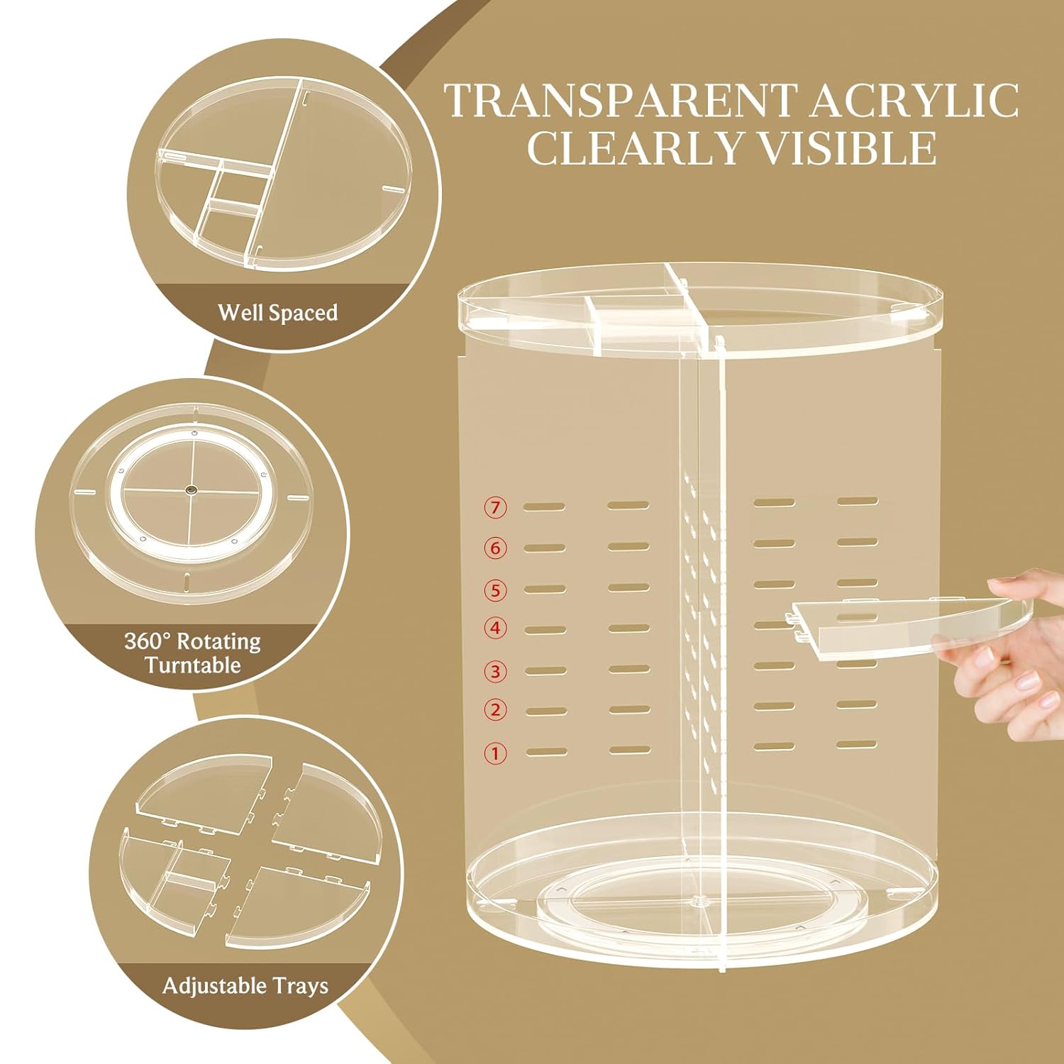 - 【7 ADJUSTABLE LAYERS & SAVE SPACE】✨360 rotating makeup organizer has four trays that you can adjust to easily store all your things. Ourmake up organizers can store at least 18 perfumes, 14 facial toners, 12 facial moisturizers, 8 makeup brushes, 6 powders, 5 makeup remover, etc. Save 70% of your desktop space.