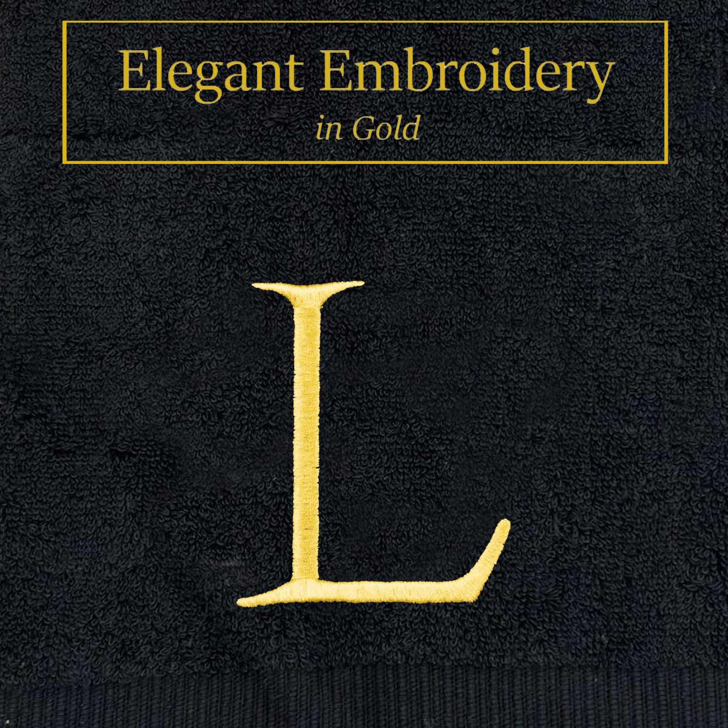 Black and Gold Bathroom Hand Towel - Monogrammed Luxury Hotel Quality Decorative Embroidered Towel for Powder Room, Spa - GOTS Organic Certified - Pack of 2, Letter L