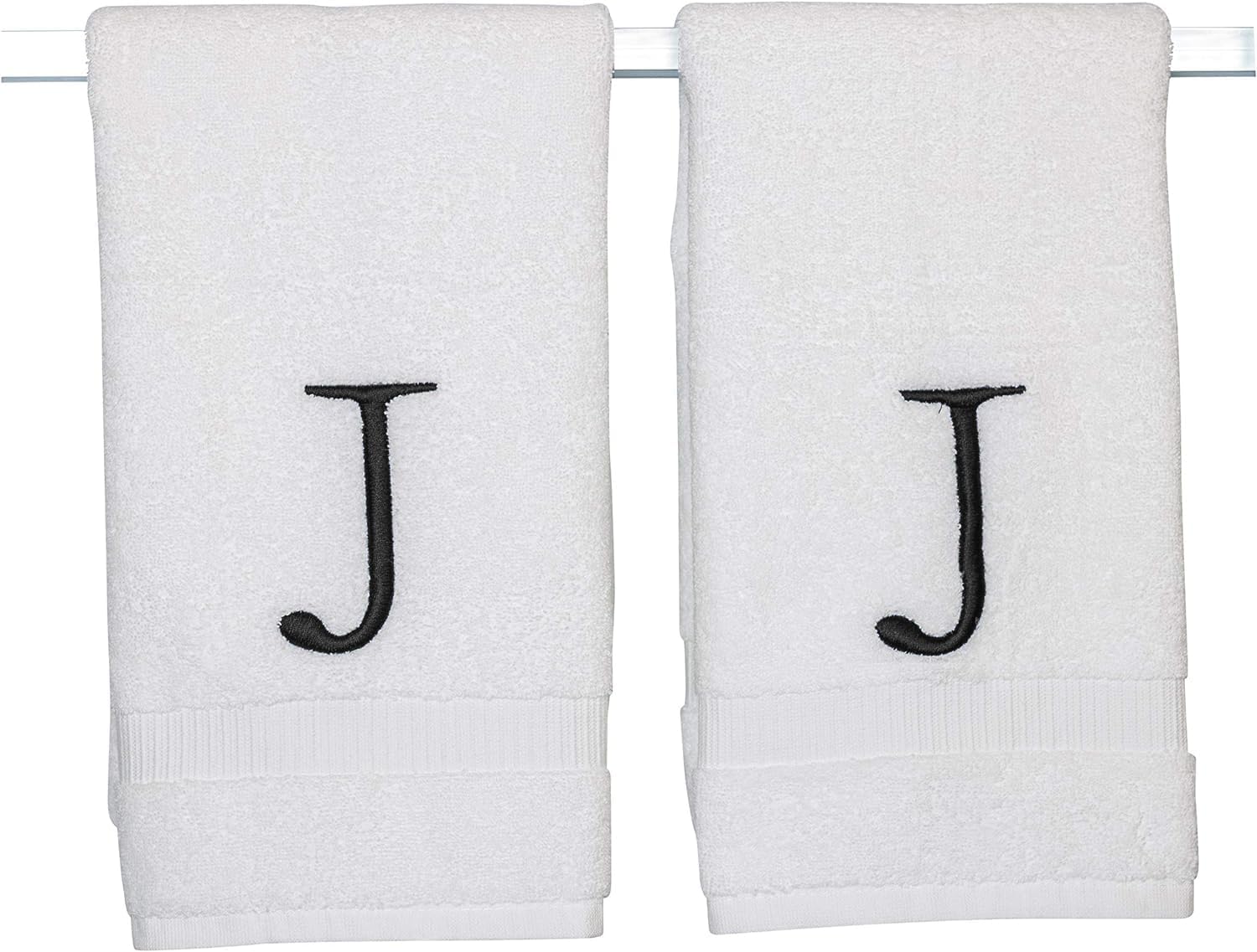 Black Letter Hand Towel for Bathroom - Monogrammed Initial Hotel Quality Decorative Embroidered Towel for Powder Room, Spa - GOTS Organic Certified - Set of 2 Letter J