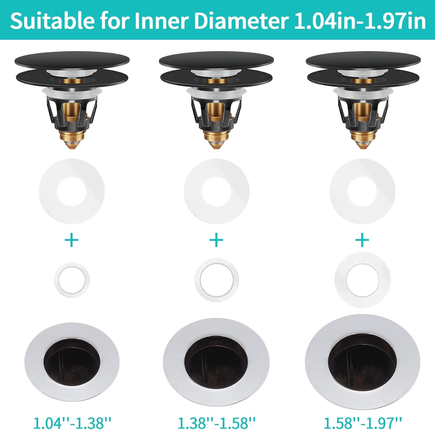 - [ Universal Size ] The bathroom sink stopper plug is mainly made of high quality thickened brass material, can be used for the different types of basin drain. The inner diameter of sink stopper strainer is 1.04ββ. Suitable for drain holes with an inner diameter of 1.04-1.97 inch.