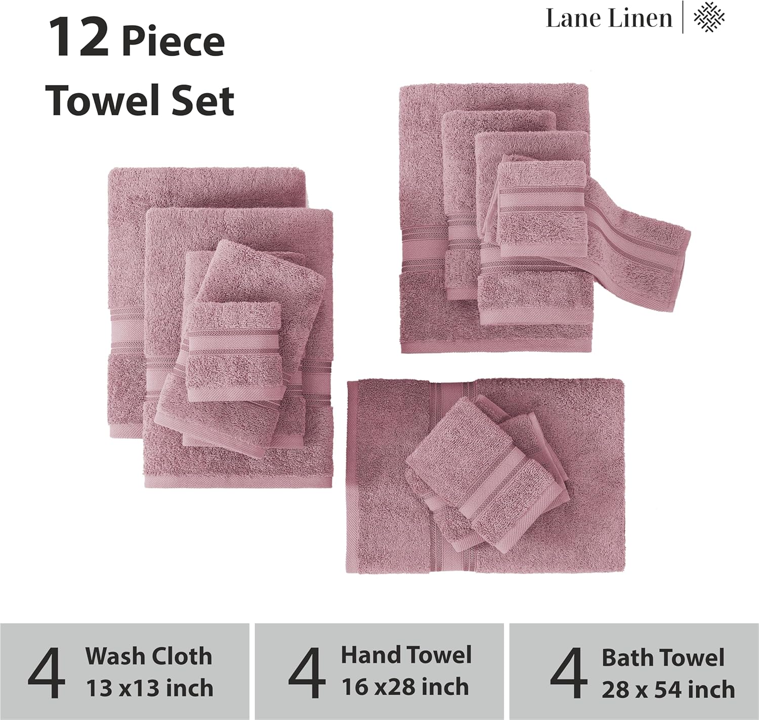 LANE LINEN Luxury Bath Towels Set - 12 Piece Set, 100% Cotton Bathroom Towels, Zero Twist, Quick Dry Shower Towel, Absorbent Bath Towel, 4 Bath Towels, 4 Hand Towels, 4 Wash Cloths - Wishful Mauve