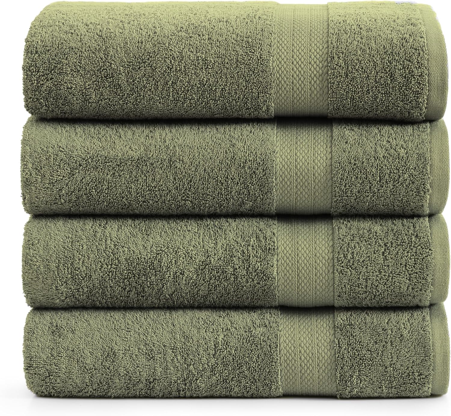 Lane Linen 100% Cotton 4 Pack Bath Towels (28"x54") - Zero Twist, Mercerized Cotton Bathroom Towels Set - Quick Dry, Very Soft & Absorbent Large Bath Towels - Tumble Dry Regains Fluffiness - Oil Green