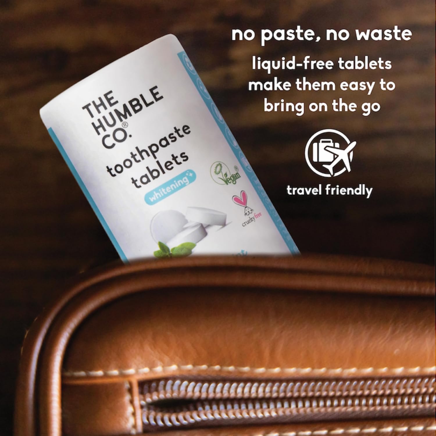 - TEETH WHITENING TOOTHPASTE TABLETS: Maintain your oral health effortlessly with Humble’s convenient teeth whitening toothpaste tabs. To use our tablet toothpaste, simply pop one in your mouth, give it a gentle bit, and start brushing with a wet toothbrush. We make our Whitening tablet toothpaste fluoride free.