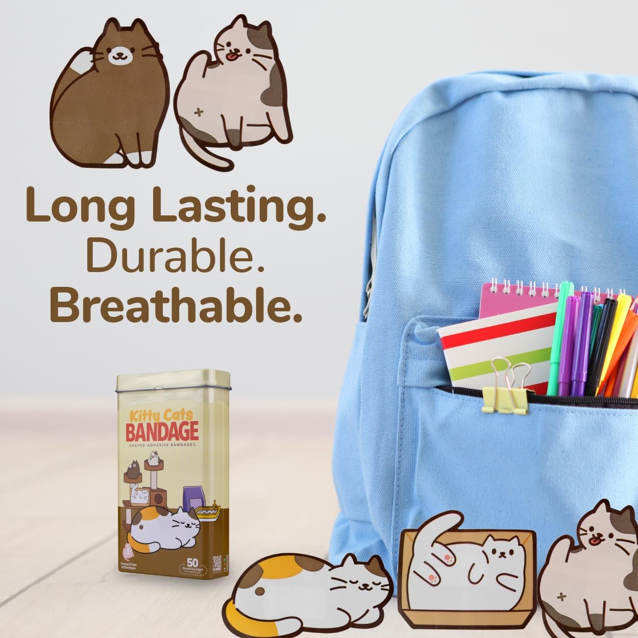 - 50 KITTY CAT KIDS BANDAGES: Fun cat-shaped adhesive bandages tin helps protect cuts, scrapes, and minor wounds while making healing less stressful for children; bandages come in 4 assorted styles