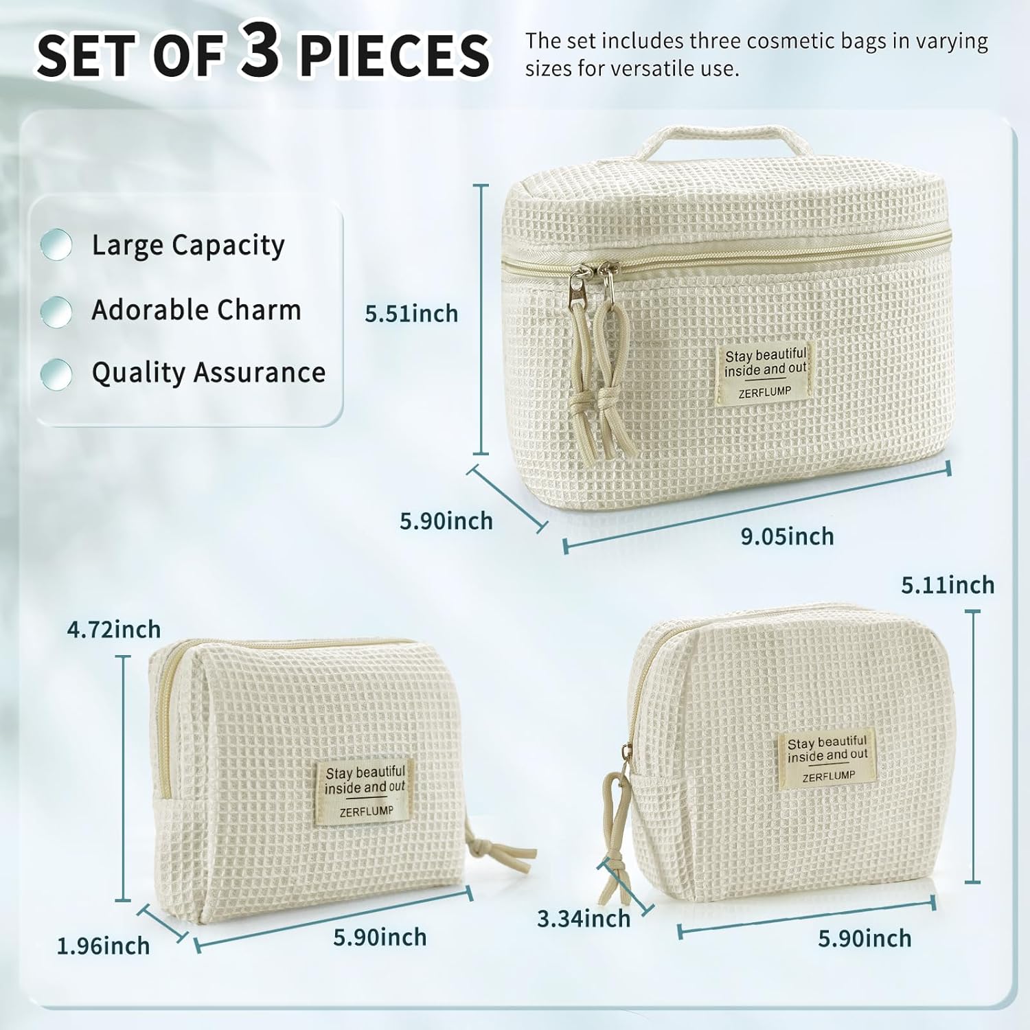 - Set of 3 Pieces: The set includes three cosmetic bags in varying sizes for versatile use. . The large size measures 9.05 x 5.9 x 5.51 inches, the medium size is about 5.90 x 3.34 x 5.11 inches, and the small size is around 5.90x 1.96 x 4.72 inches.