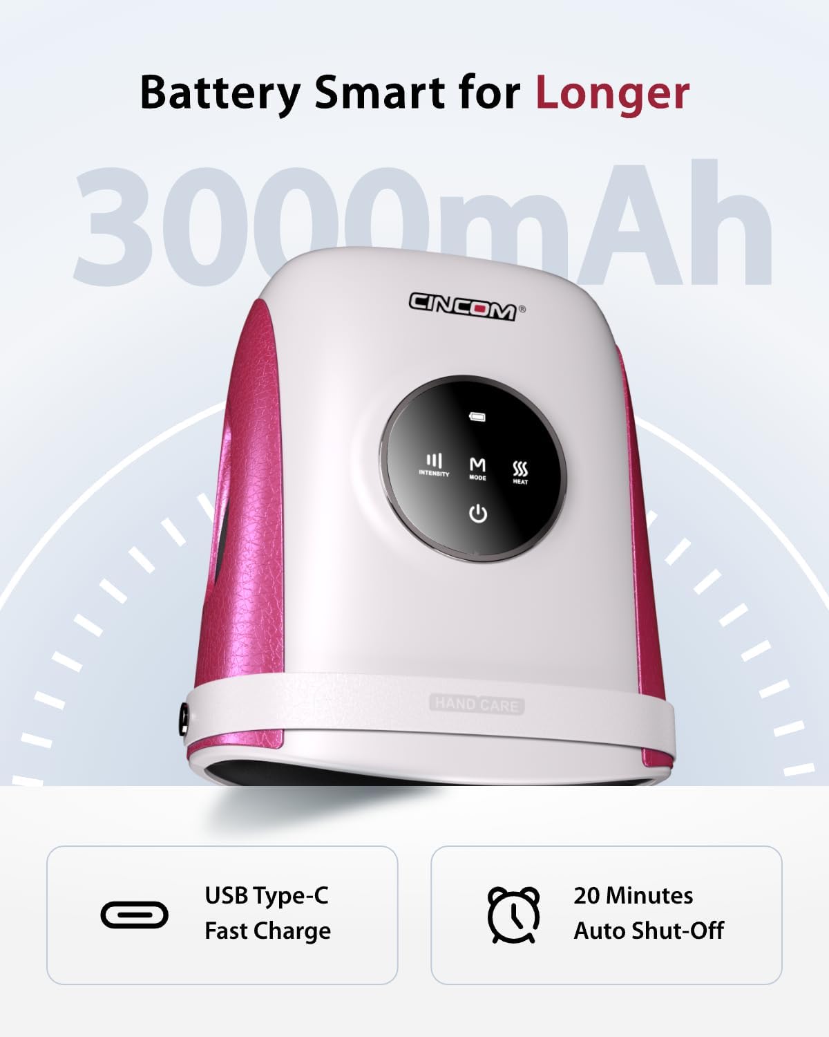- CINCOM Hand Massager : Multiple Massage Modes to enjoy a variety of customizable settings, including kneading, air compression, and soothing heat to relieve stress and discomfort in the palms, fingers, and knuckles