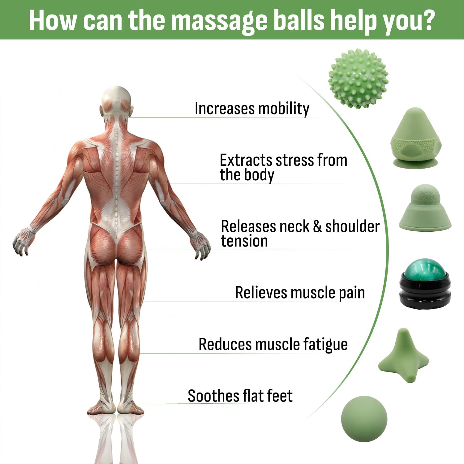 - The most comprehensive muscle massager set: Our massage ball set includes a textured massage ball with spikes, a triangular massager with suction, a lacrosse massage ball, a hand exercise ball, a 360-degree spinning massage ball with a roller, and a half sphere ball with suction and flat base.