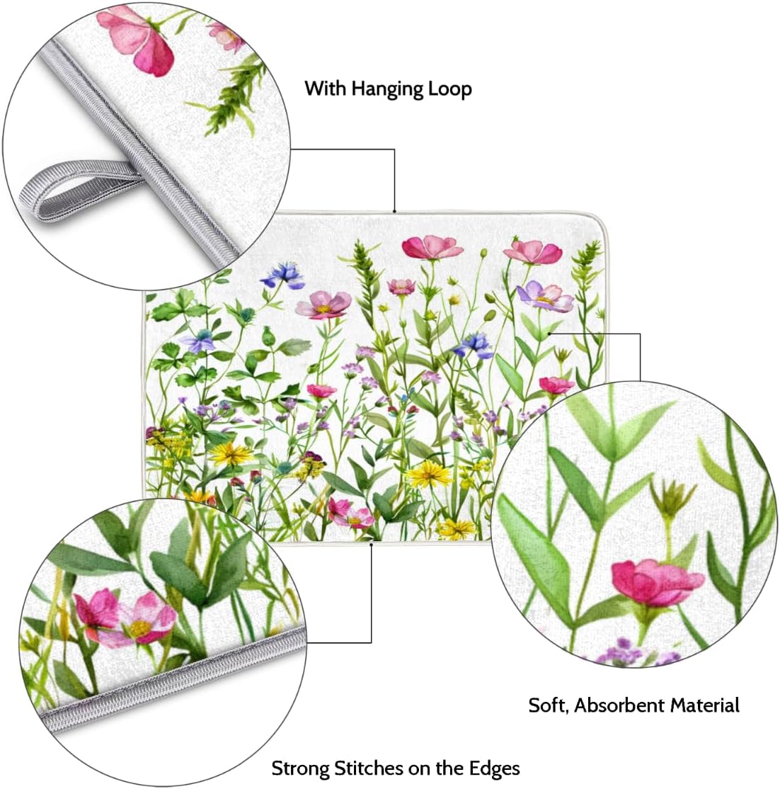 Hexteria Colorful Flowers Dish Drying Mats for Kitchen Counter 16 X 18 Inch Spring Floral Microfiber Dish Mat, Dish Drainer Mats for Countertops, Wildflower