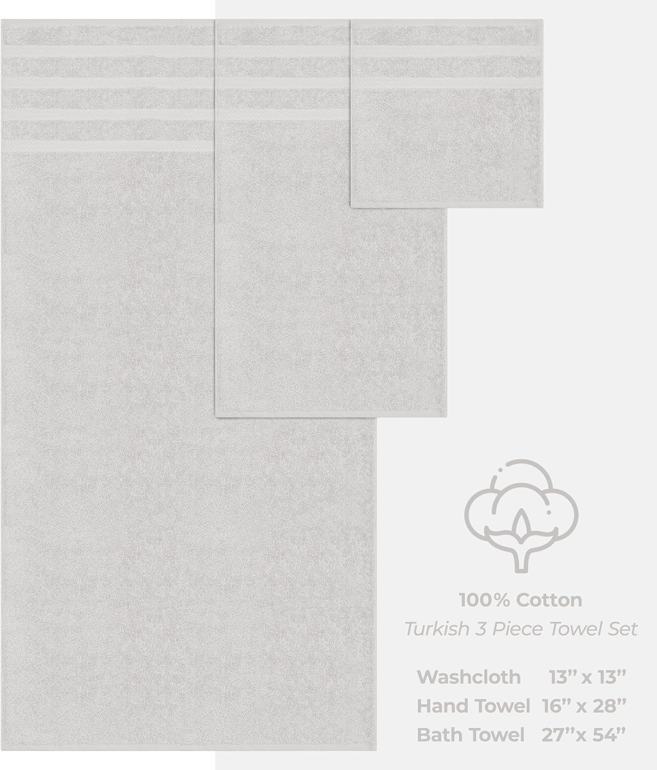 - ✅ Turkish Premium 3 Piece Towel Set Includes 1 Bath Towel of 27 x 54 inches, 1 Hand Towel of 16 x 28 inches and 1 Washcloth of 13 x 13 inches.