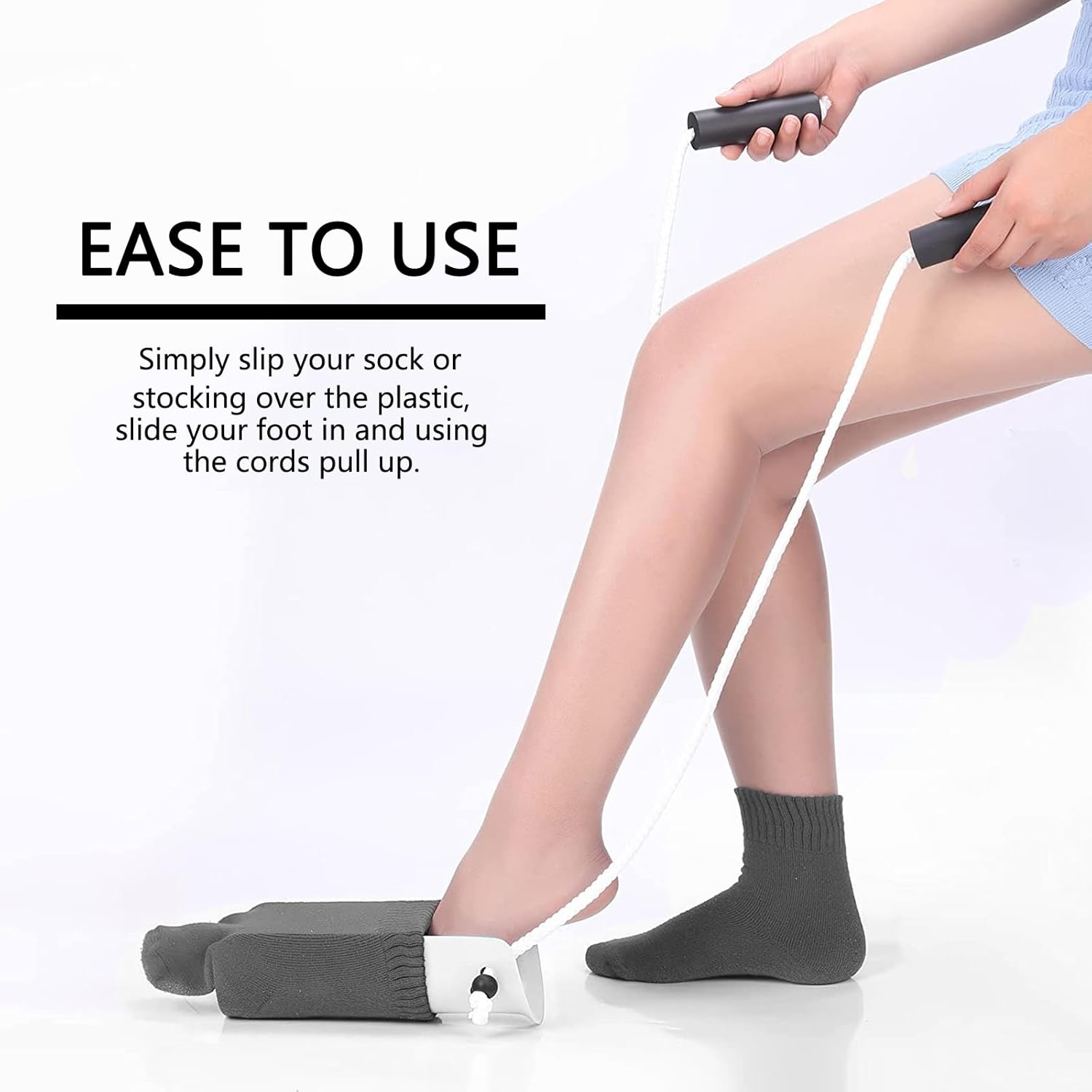 - EASILY PUT ON SOCKS: Easily put on your own socks or hosiery with the sock assist device. Perfect for those recovering from surgery, injury or those with limited mobility. Latex-free plastic shell contours to slide over the foot and heel, pulling up the sock with ease.