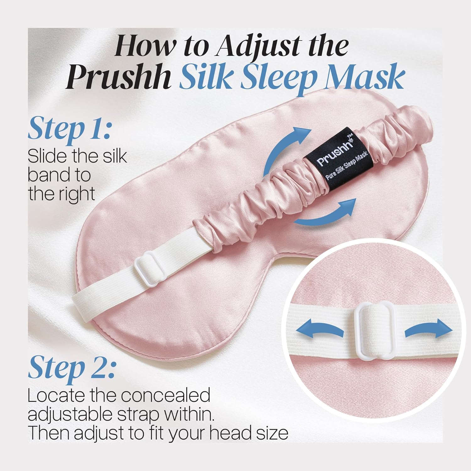 - 【Adjustable For Your Perfect Fit With A Customizable Strap】Adjust the Prushh Silk Sleep Mask to your own personal comfort with an concealed and easily adjustable strap band that makes it suitable for all head sizes for both Women and Men. This ensures a great fit, tangle-free sleep, and a mask that stays in place all night.