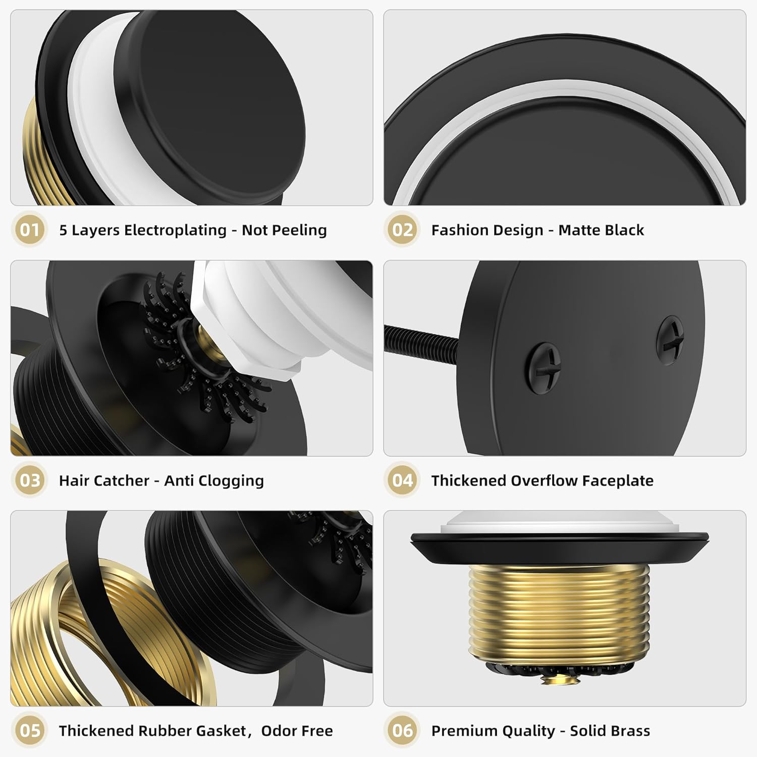 - Beautiful Finish: Anti-fingerprint matte black tip-toe bathtub drain matches your faucet and bathroom decor; 5-layer electroplating protects against rust, peeling, and corrosion; maintains appearance over time