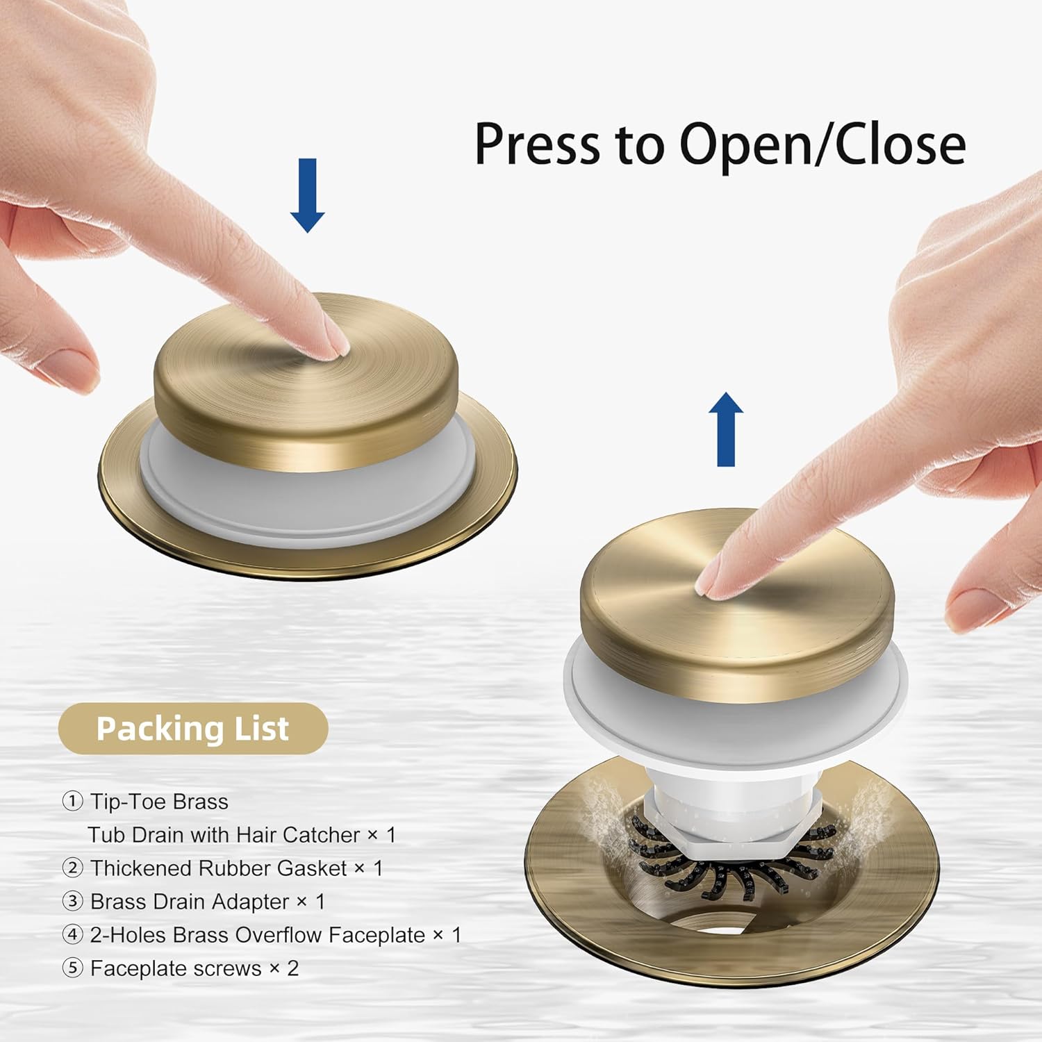 - Beautiful Finish: Anti-fingerprint brushed gold tip-toe bathtub drain matches your faucet and bathroom decor; 5-layer electroplating protects against rust, peeling, and corrosion; maintains appearance over time