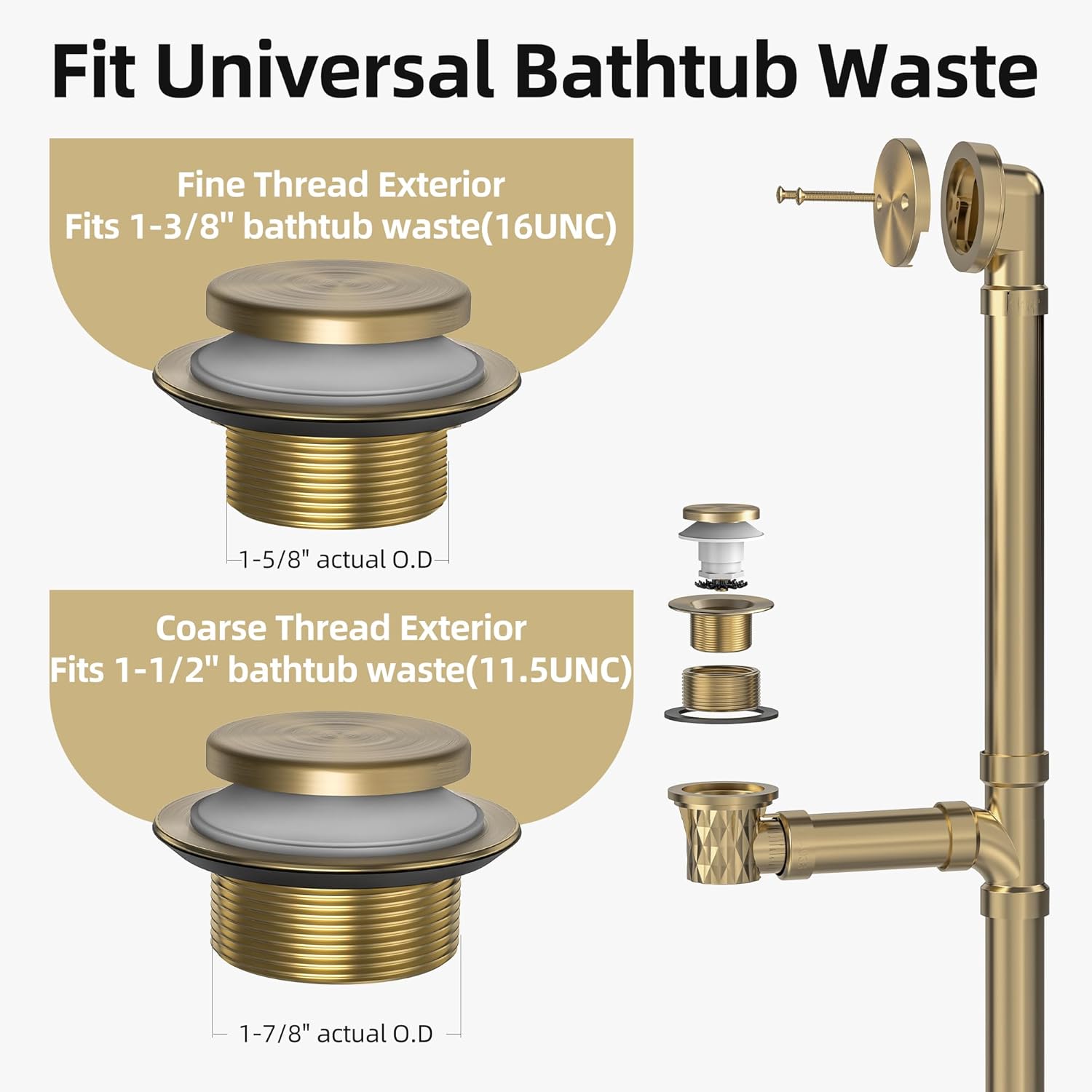 - Universal Fit: Brushed gold bathtub drain is cUPC approved; fits 1 3/8 in. NPSM and 1-1/2 in. NPSM bathtub waste elbows; designed to work with US/CA standard bathtubs