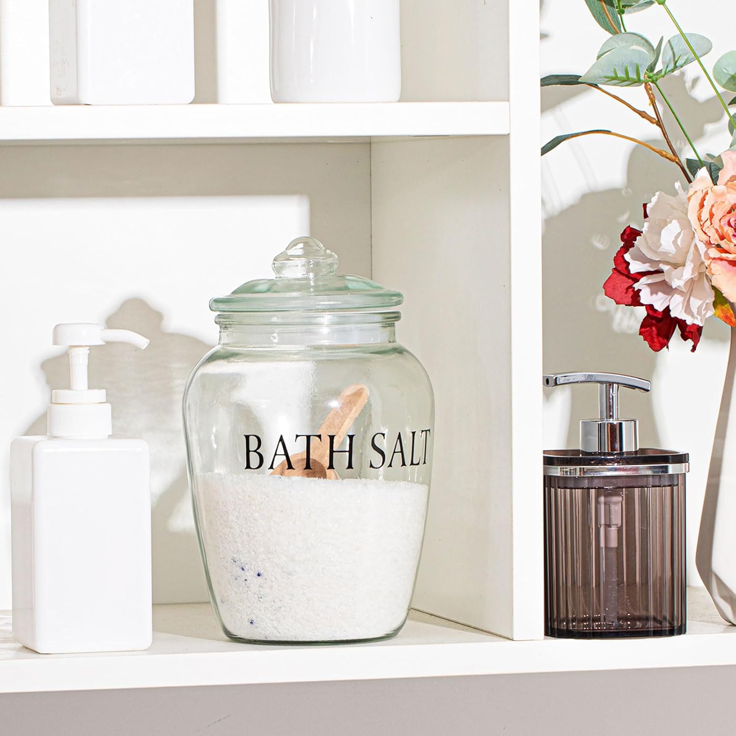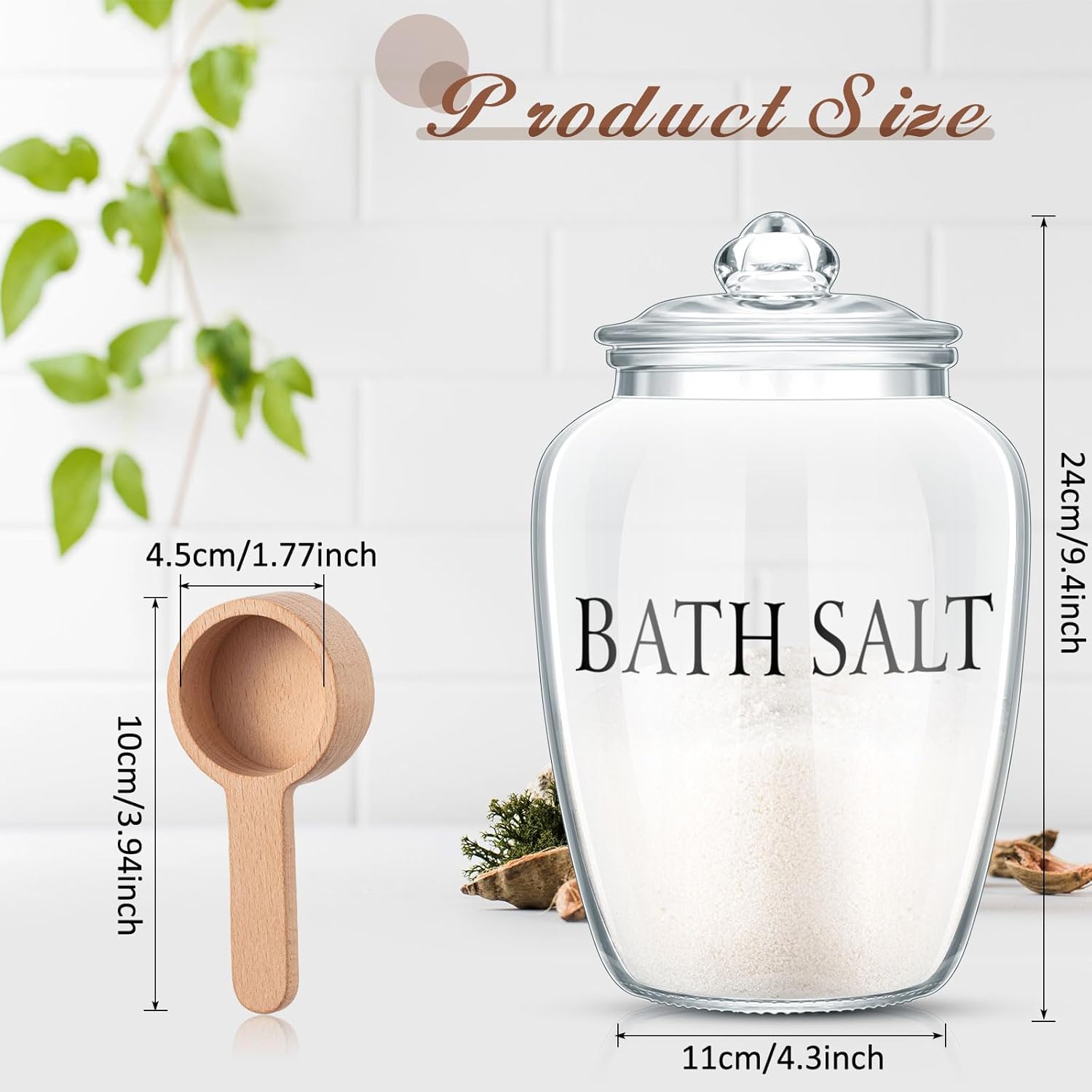 - Distinctive Craftsmanship: crafted with glass and equipped with a wooden scoop, the 2 sets of bath salts glass jars don't just satisfy your storage needs, they add a touch of classic and rustic to your bathroom or kitchen decoration; Their size of about 9.65 x 5.91 inches with a capacity of about 74 oz offers ample space to store bath salts or even laundry soap