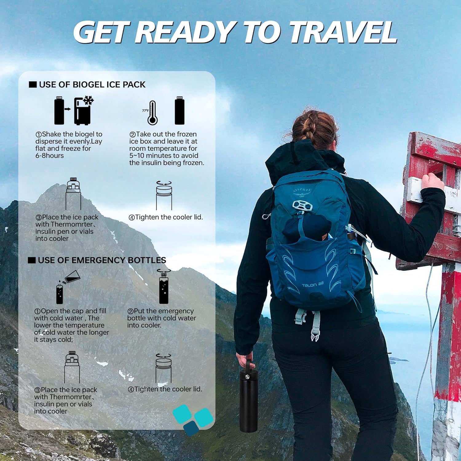 - 2 COOLING METHODS: 1) The blue ice pack with biogel provides 48 hours of cooling time; 2) The white ice water bottle adds an additional 12 hours of cooling time when filled with ice water; So you can travel without worrying about your medication expiring
