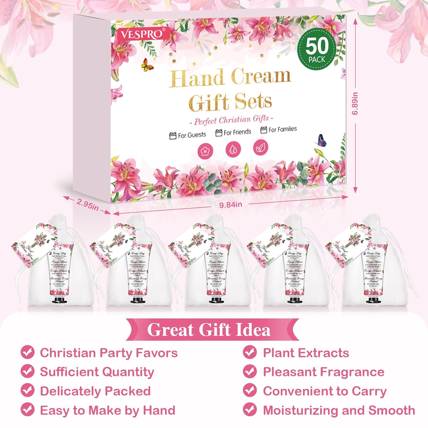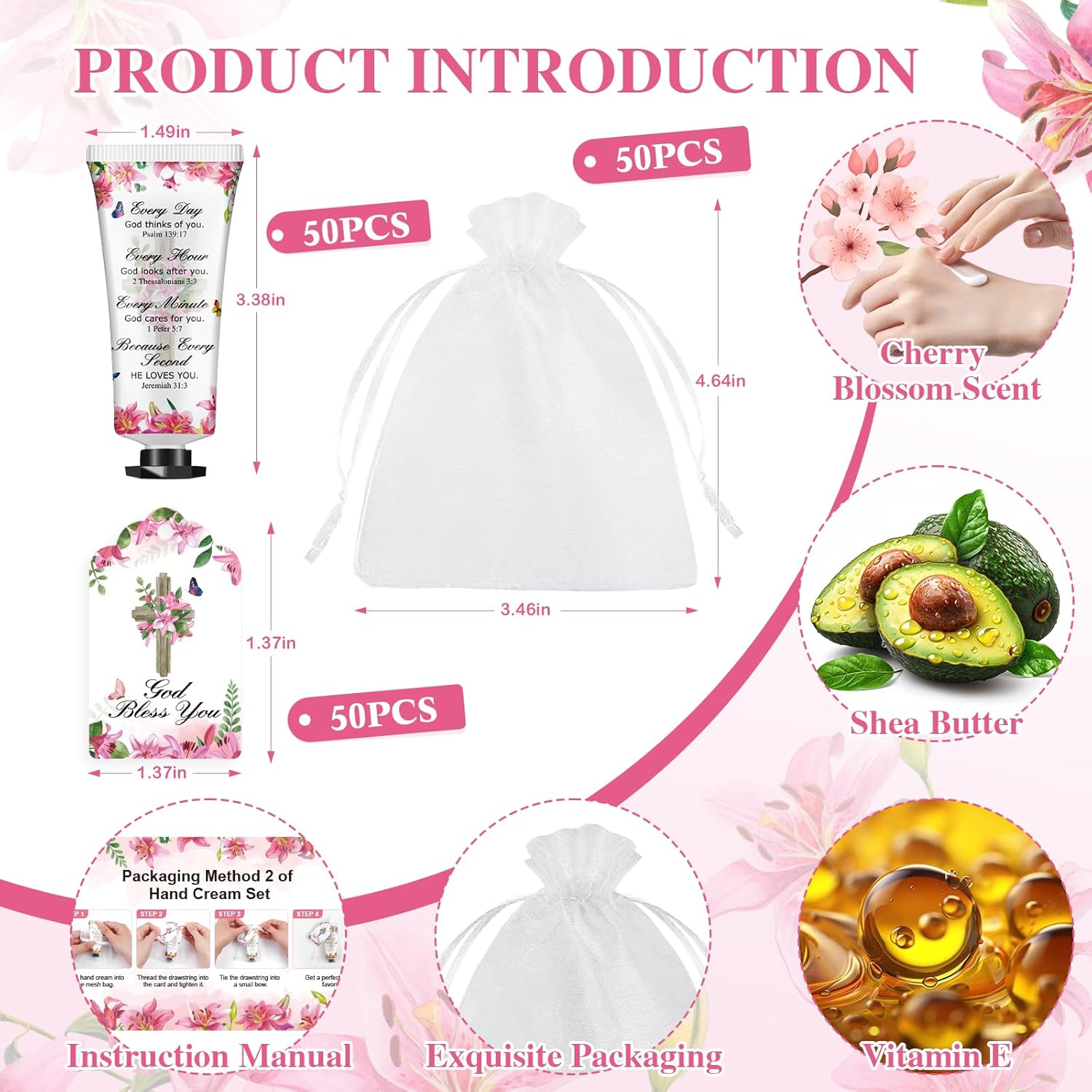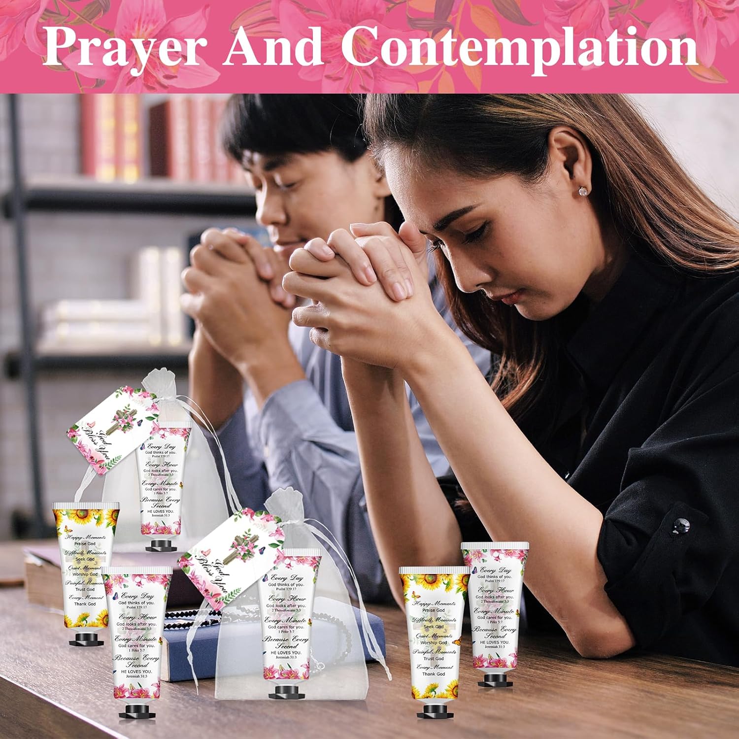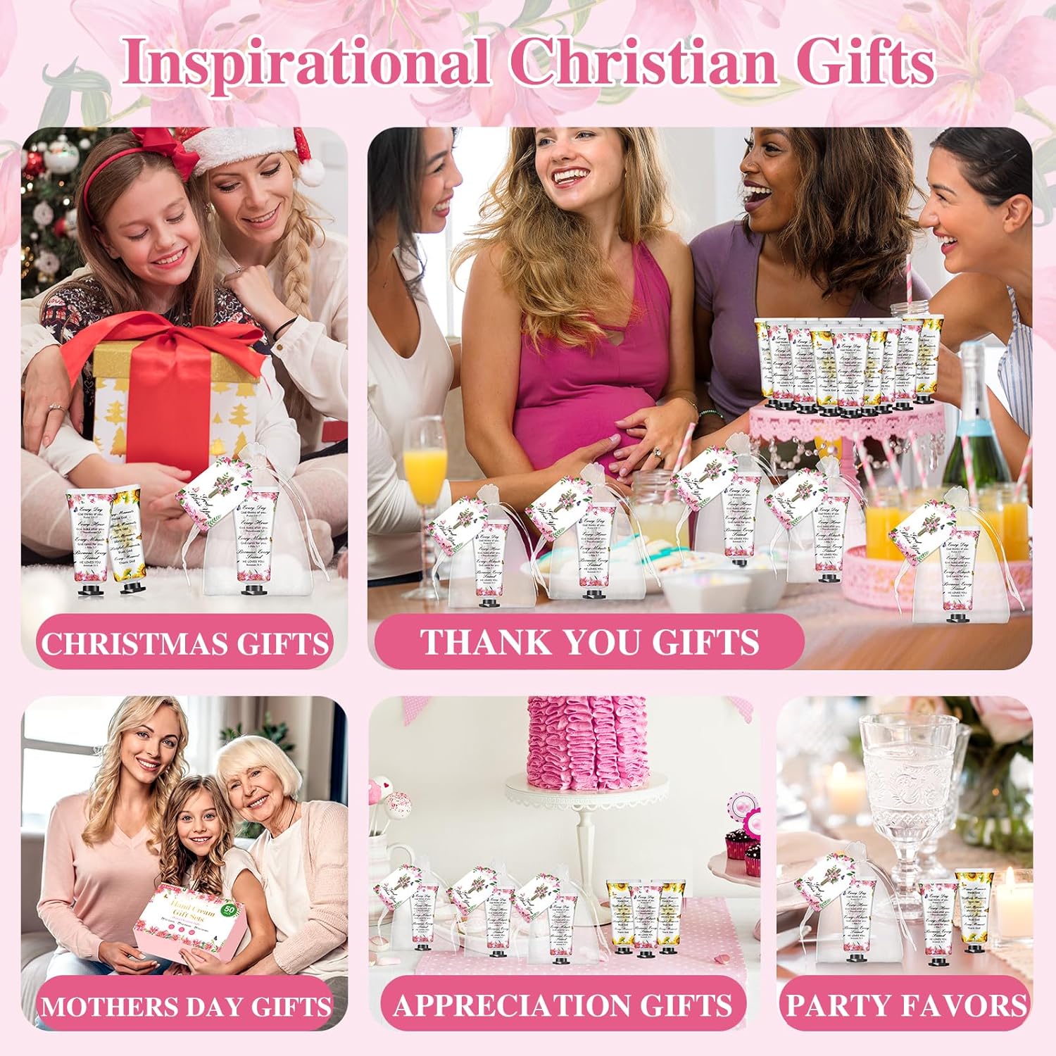 - 【50Pack Christian Hand Cream Gifts】This christian gifts set includes 50pcs hand creams,50pcs organza gift bags,50pcs prayer cards and 1pcs DIY manual.sufficient quantity and perfect combination to meet the needs of various scenarios,such as Mother's Day gifts, exquisite gifts for church events and gatherings.