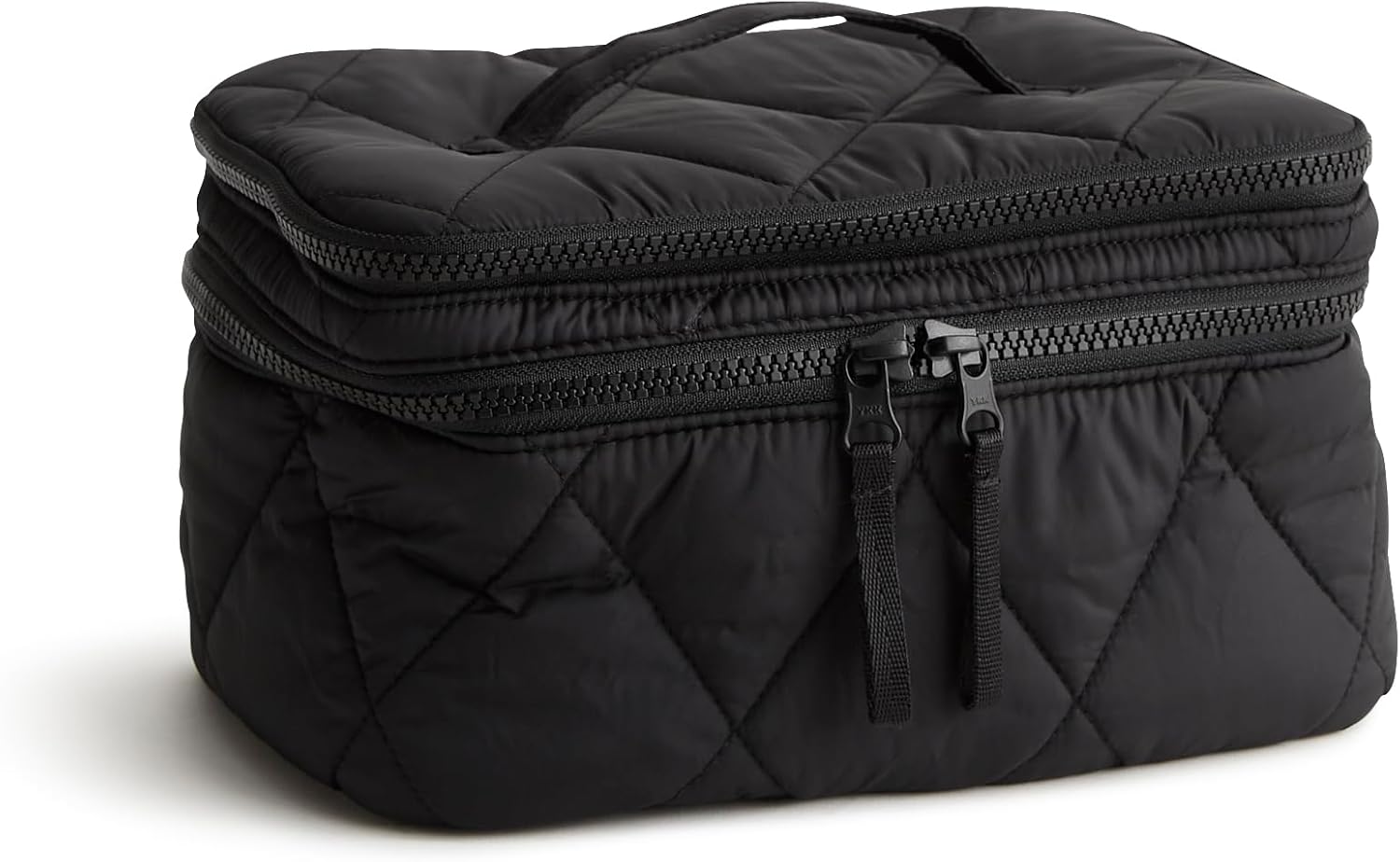 - DETAILS - Interior features two zip pockets, two slip pockets, and eight elastic makeup brush loops with a wipeable TPU cover