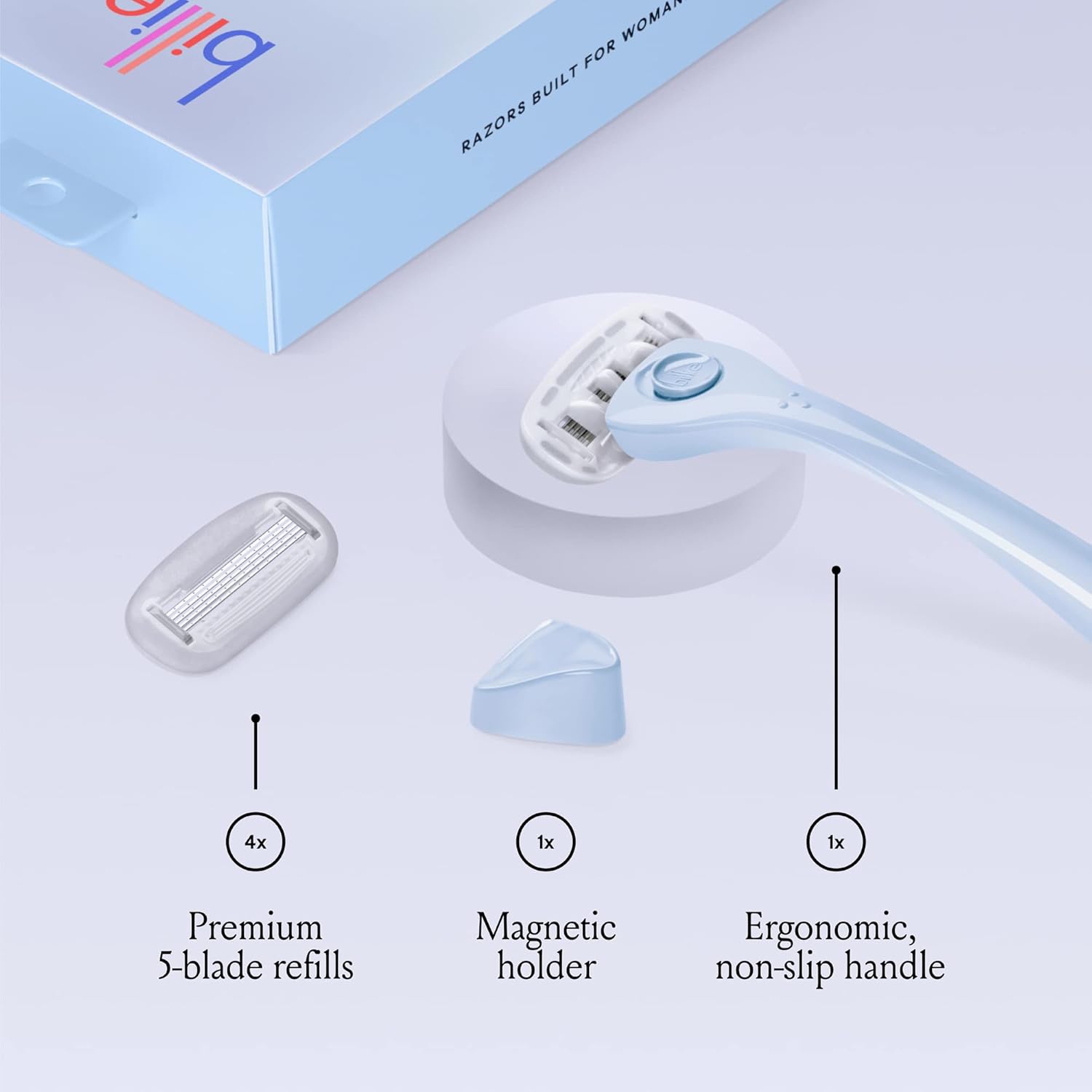 Billie Razors for Women Shave Kit with Women’s Razor, 4 x 5-Blade Razor Refills, Magnetic Holder - Cool Blue and Malibu