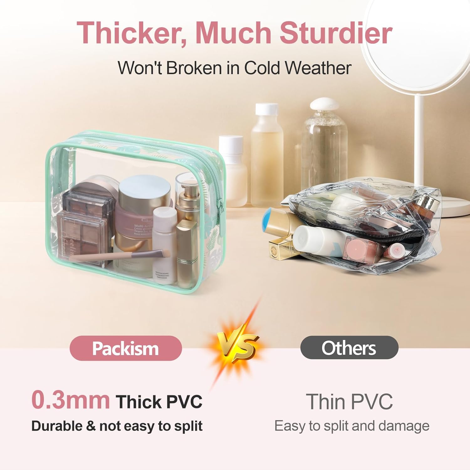 - Robust and Long-Lasting: Our clear toiletry bags outlast the average flimsy plastic bag on the market, for it is made from 0.3 mm thick PVC. Its reinforced design features heat-sealed and metal closures, ensuring it withstands even the tumultuous travel for sustainable reuse