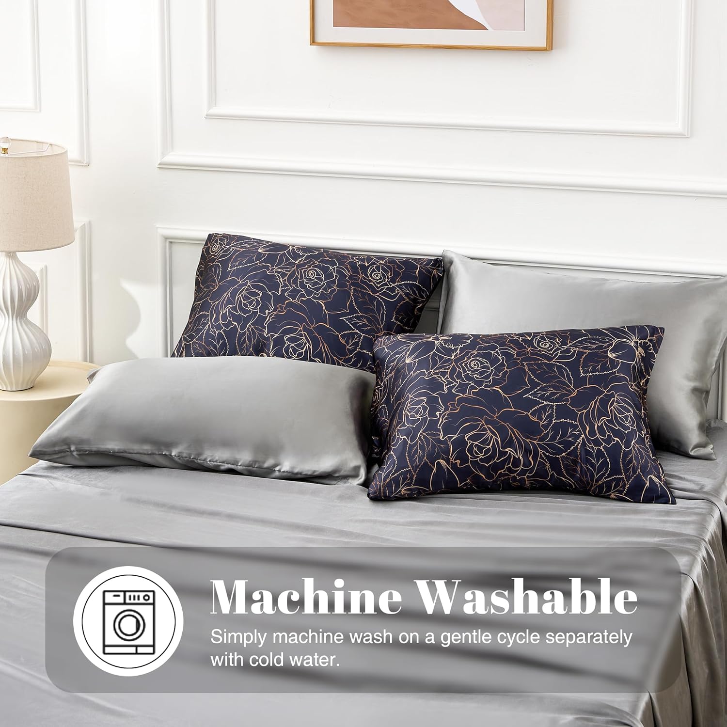 EXQ Home Satin Pillowcase for Hair and Skin- Rose on Blue Silk Pillowcase 2 Pack 20x26 inches - Standard Size Pillow Cases with Envelope Closure, Gifts for Women