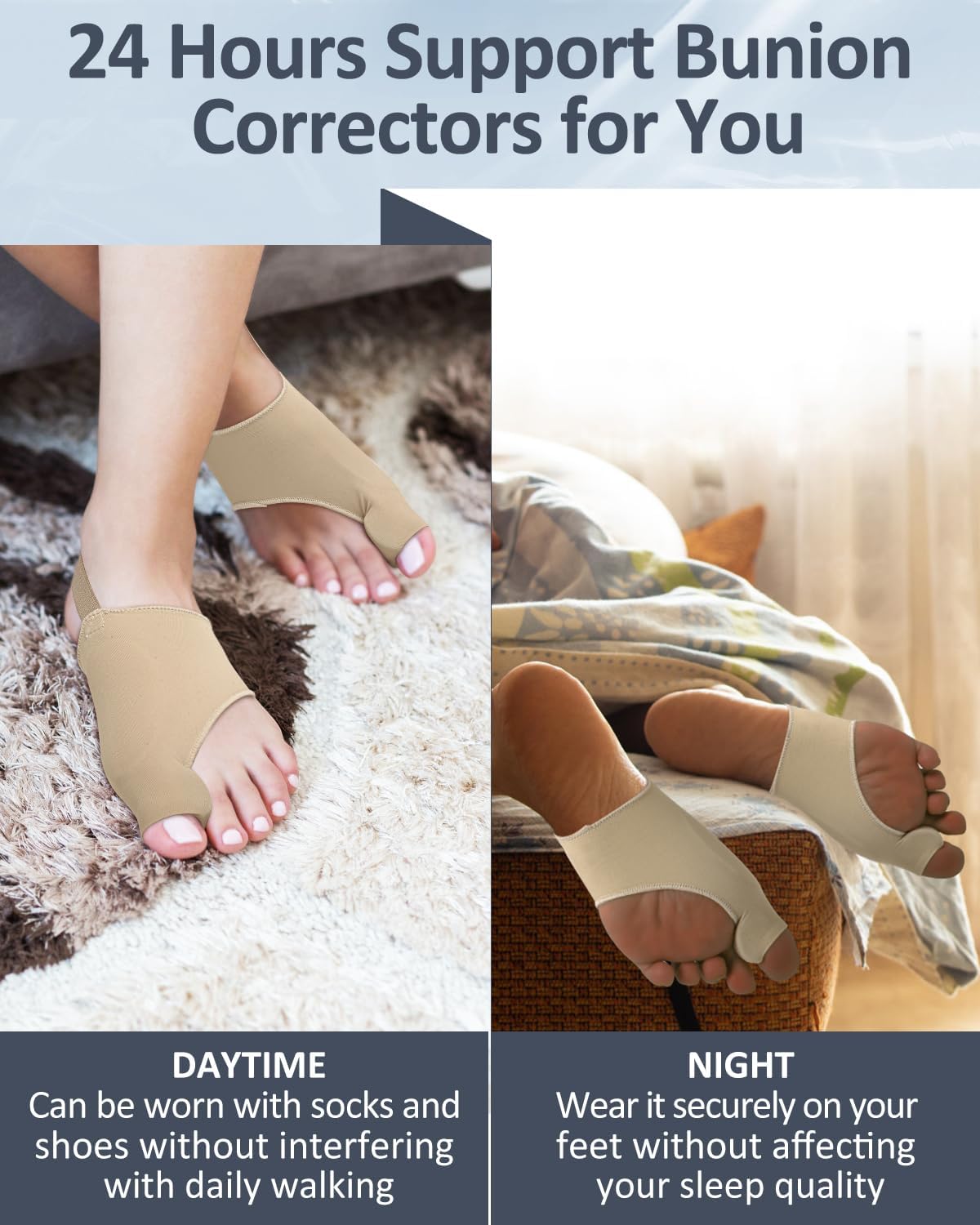 - 【All Day Stabilizing Support】This bunion toe spscers with a silicone gel pad that protects the bunion. It acts as a buffer to the sensitive bunion area to prevent rubbing and friction, so it can be worn day or night for you to help manage hallux valgus discomfort