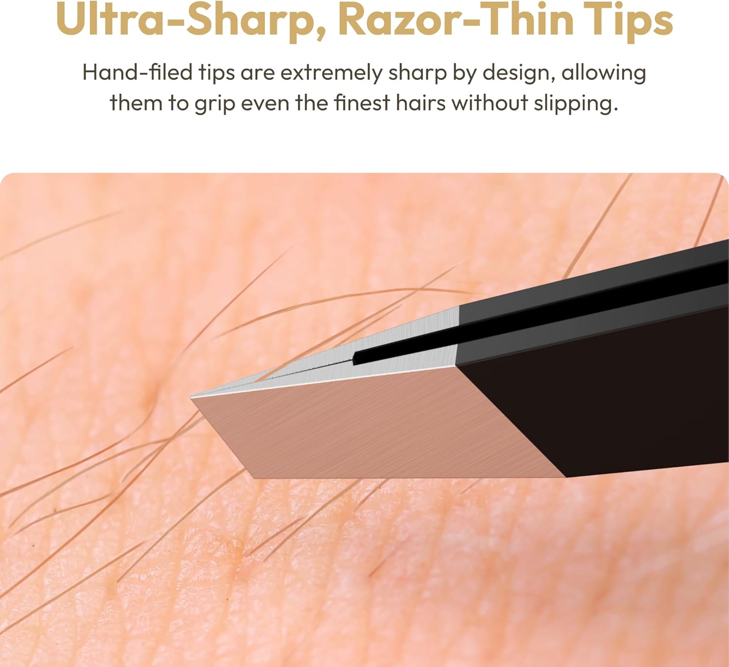 - [Ultra-Precision Sharpening] Each tweezer is hand-sharpened to ultra-precision, ensuring a firm grip on even the finest and shortest hairs for flawless results.