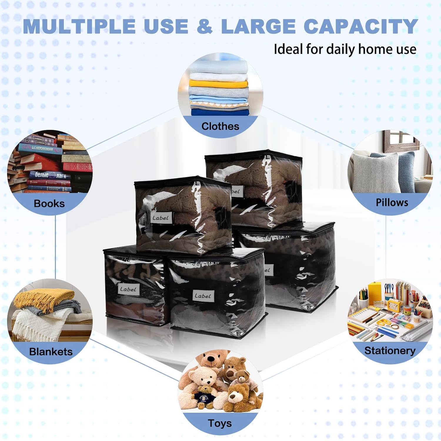Clear Zippered Storage Bags Plastic Sweater Storage Bags with Zipper 6 Packs Clothing Organizer for Blankets Linen Sweater Bed Sheet Quilt Clothes Pillow (12 x 12 x 12 Inch, Black)