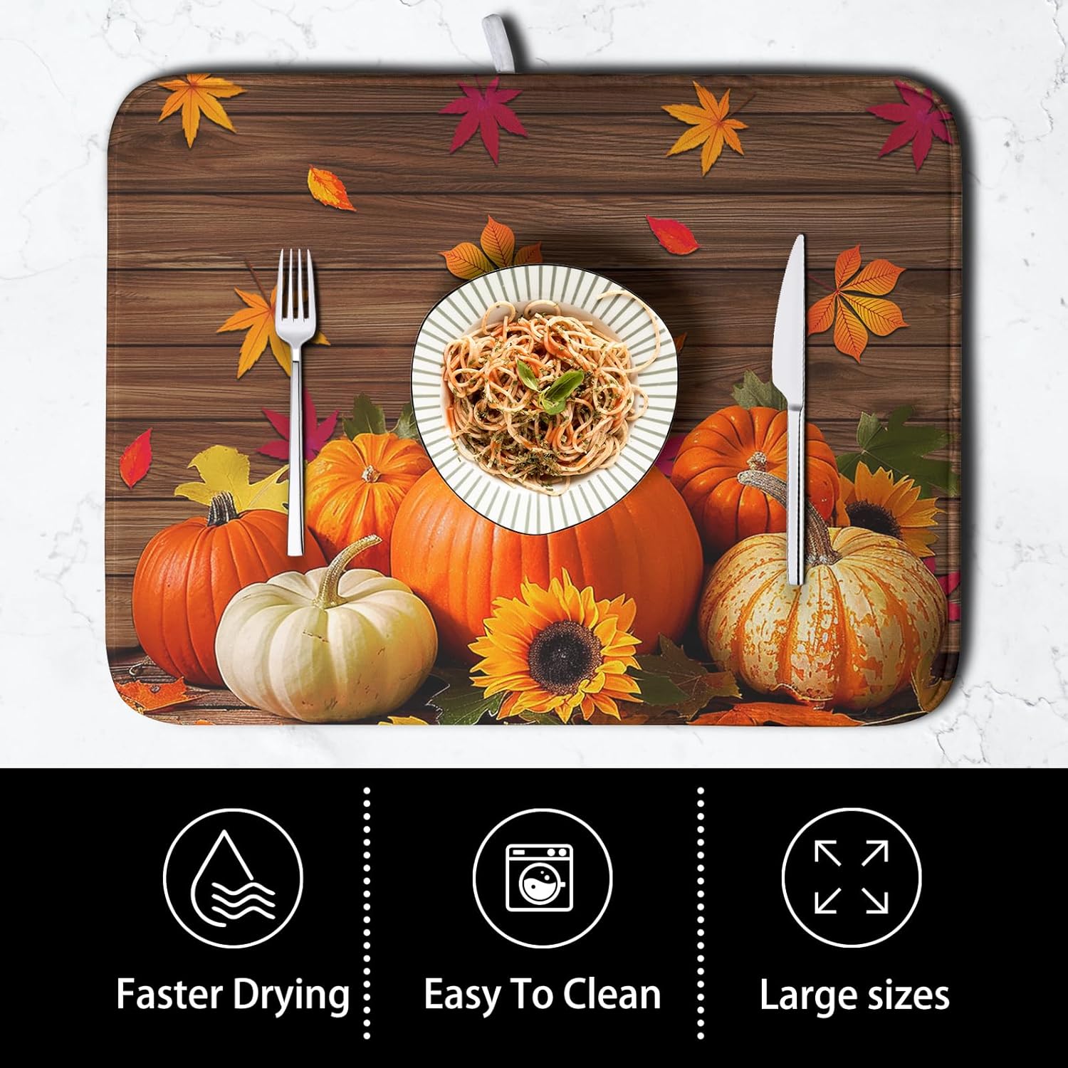 - 【Ultra Absorbency】The surface of the fall orange pumpkin dish drying mat is made of absorbent microfiber and the middle is made of composite sponge, absorbs 4X its weight in water, keep your counter dry. Absorbent, Colorful, Reversible, do not fade.