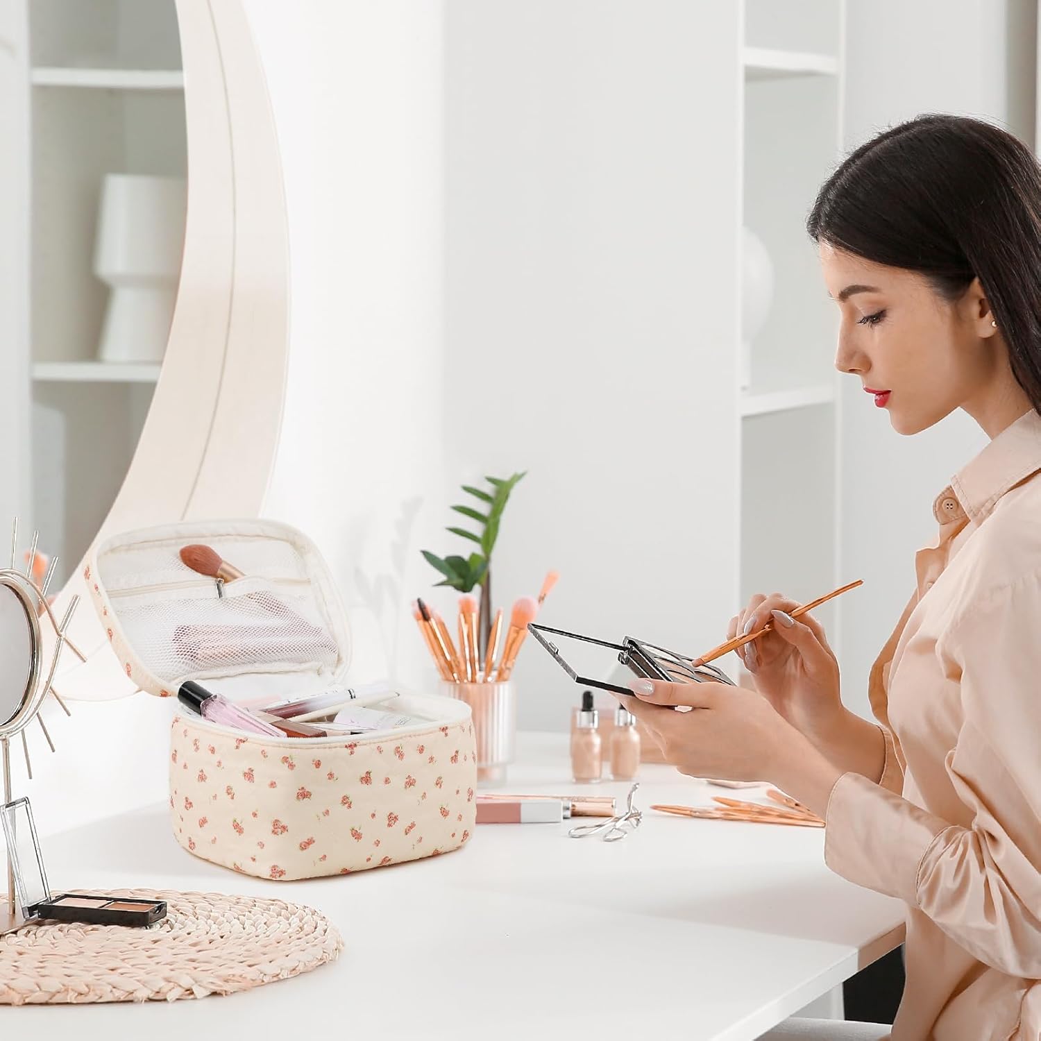 Prite Large Makeup Bag for Women Quilted Floral Cotton Cosmetic Bag Cute Coquette Aesthetic Floral Travel Toiletry Bag (Pink Flower)