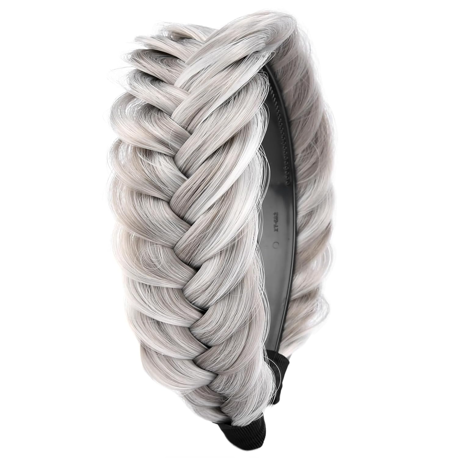 DIGUAN Wide Messy Braided Headband With Teeth Synthetic Hair Plaited Headband High Elasticity Braids Chunky Fishtail Braided Hair Band Hairpiece for Girls Women Beauty Accessory (Smoky Gray)