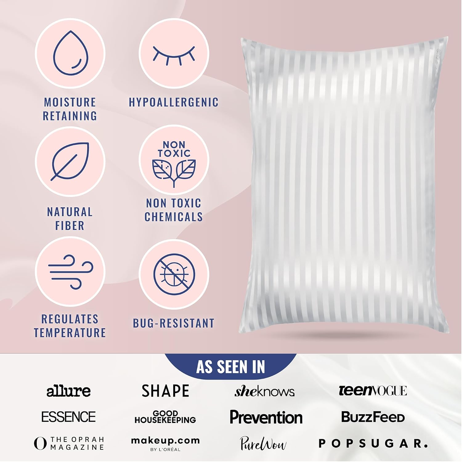 Blissy Silk Pillowcase - 100% Pure Mulberry Silk - 22 Momme 6A High-Grade Fibers - Silk Pillow Cover for Hair & Skin - Regular, Queen & King (White Striped, Standard)