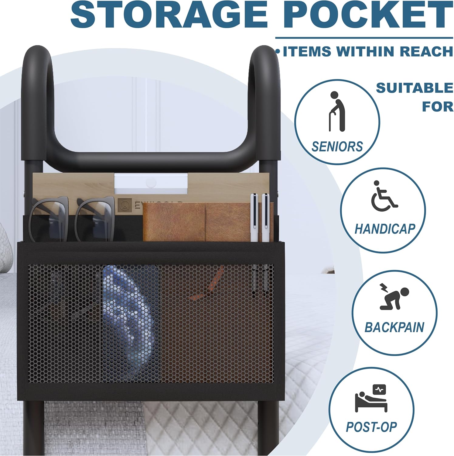 - Convenient Design - This bed side rail incorporates a storage pocket for keeping essentials within reach. The adult bed rails are designed to provide a comfortable, secure grip for elderly adults, serving as a practical bed assist bar with storage pocket. This bed assist bar with storage pocket is a necessary bed rails for elderly adults. It's ideal for seniors who require bed assist rails or as a bed cane assist handle. It also works as a bariatric hospital bed rail.