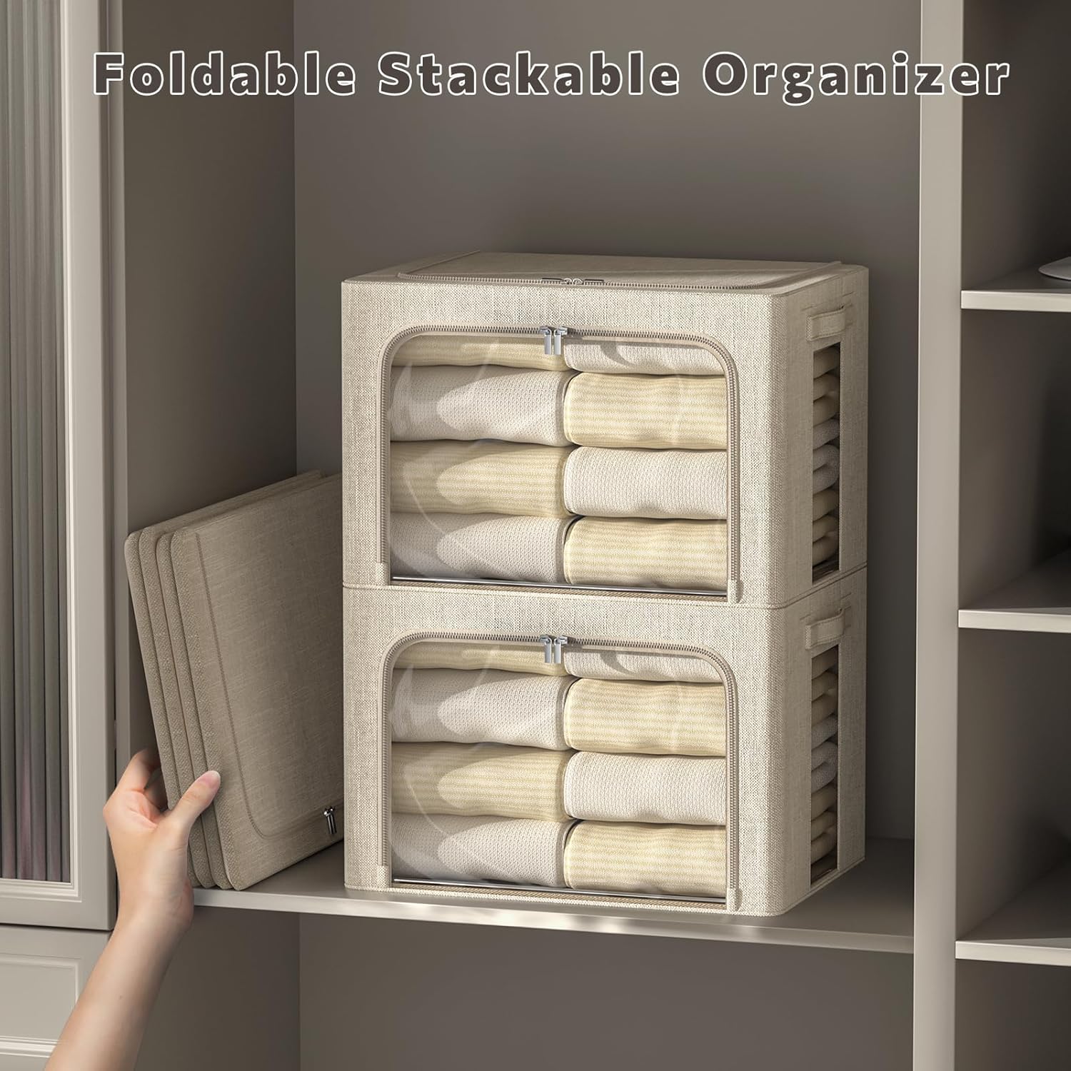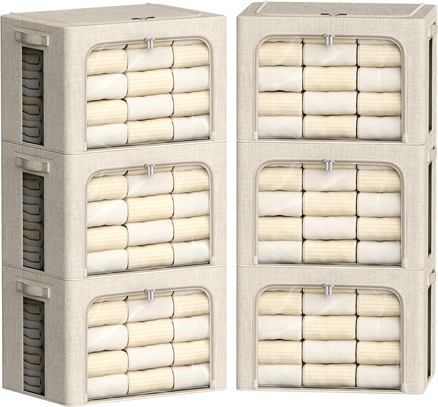FHSQX 6 Pack Clothes Storage Bins with Metal Frame 100L Foldable Storage Bins for Clothes Linen Fabric Storage Box with Clear Window (Beige, 23.6x16.5x15.7inch(100L))