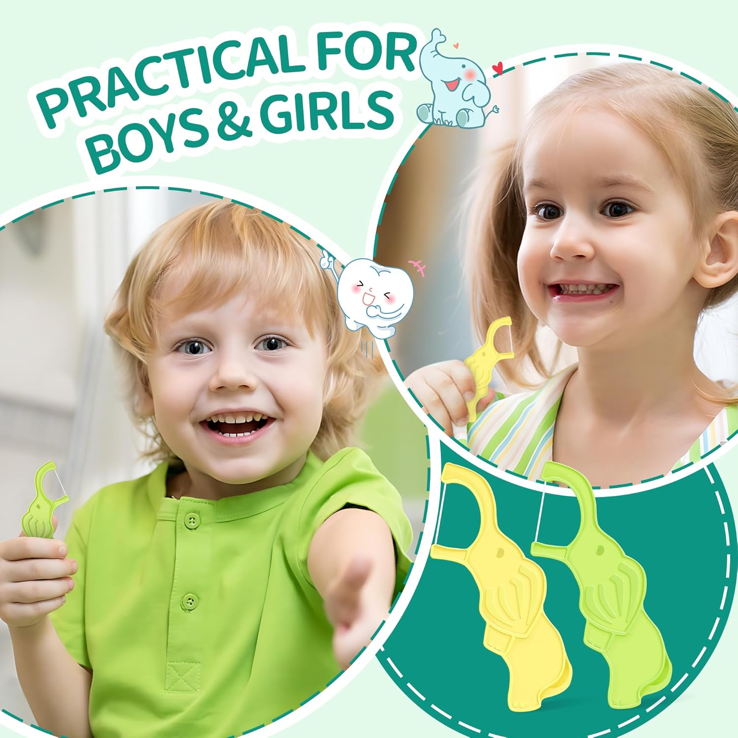 - 【Fun Elephant Design】200 counts of adorable elephant-shaped floss picks and vibrant colors transform flossing into a fun activity, helping kids increase their interests and develop healthy dental habits from an early age and reducing plastic waste