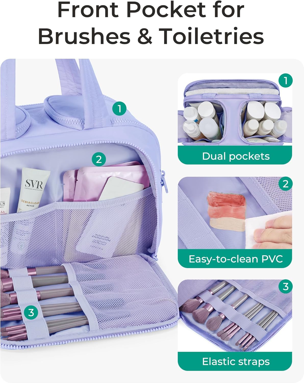 - Easy Access and Keep Upright : Full opening and not piling up for easy access to items. Double side full open design of travel bag for toiletries keeps cosmetic bottles and toiletries can stand upright in the middle compartment. Avoid leakage during transit