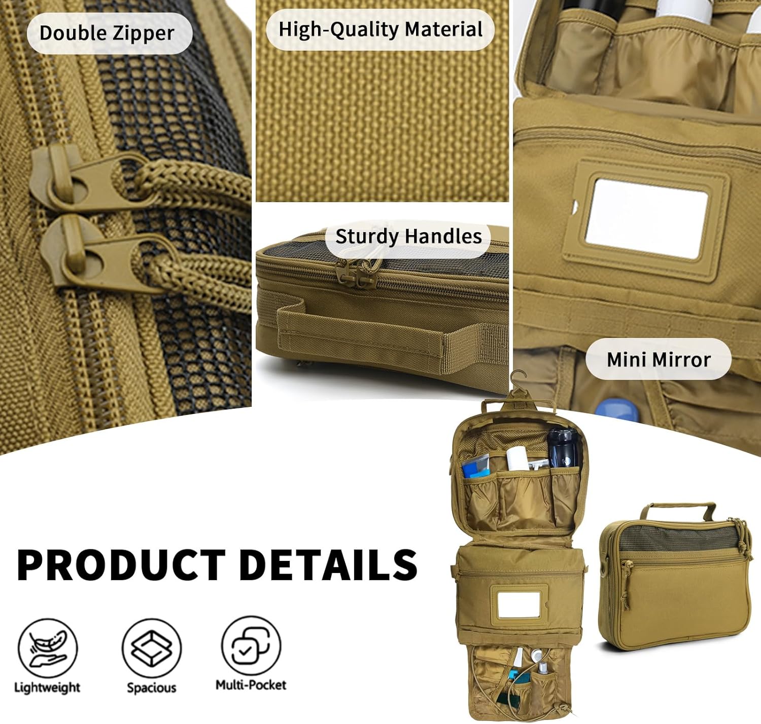 - Multi-Functional Hanging Toiletry Bag for Men - Built-In 360Β° Rotating Hook for Bathroom/Campsite Use + Front MOLLE Panel Compatible with Carabiners & Accessories, Back Zipper Pocket Secures Valuables.