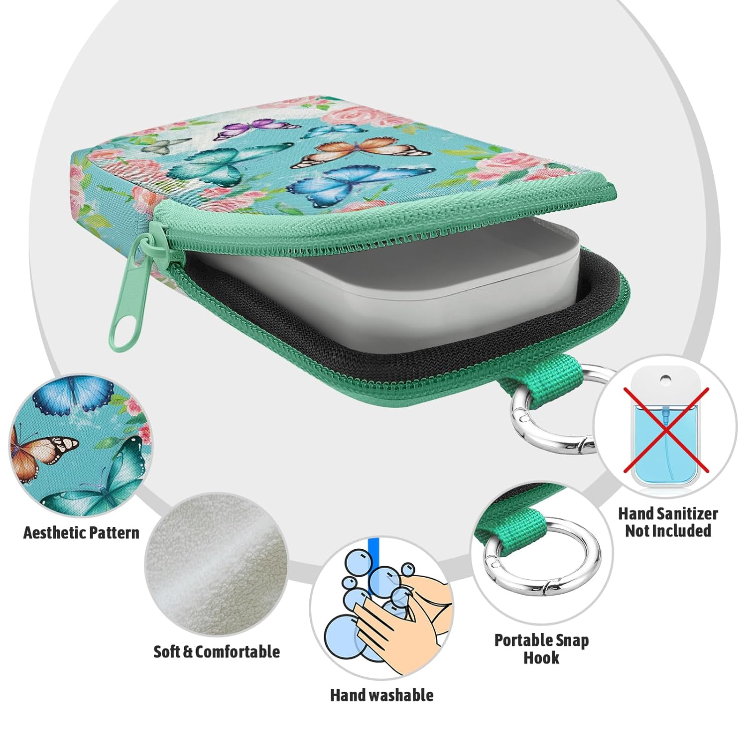 Butterfly Floral Hand Sanitizer Spray Case, Cute Hand Sanitizer Holder Zippered Pouch, Fashion Accessory with Snap Hook for Glow Mist and Power Mist 1FL OZ