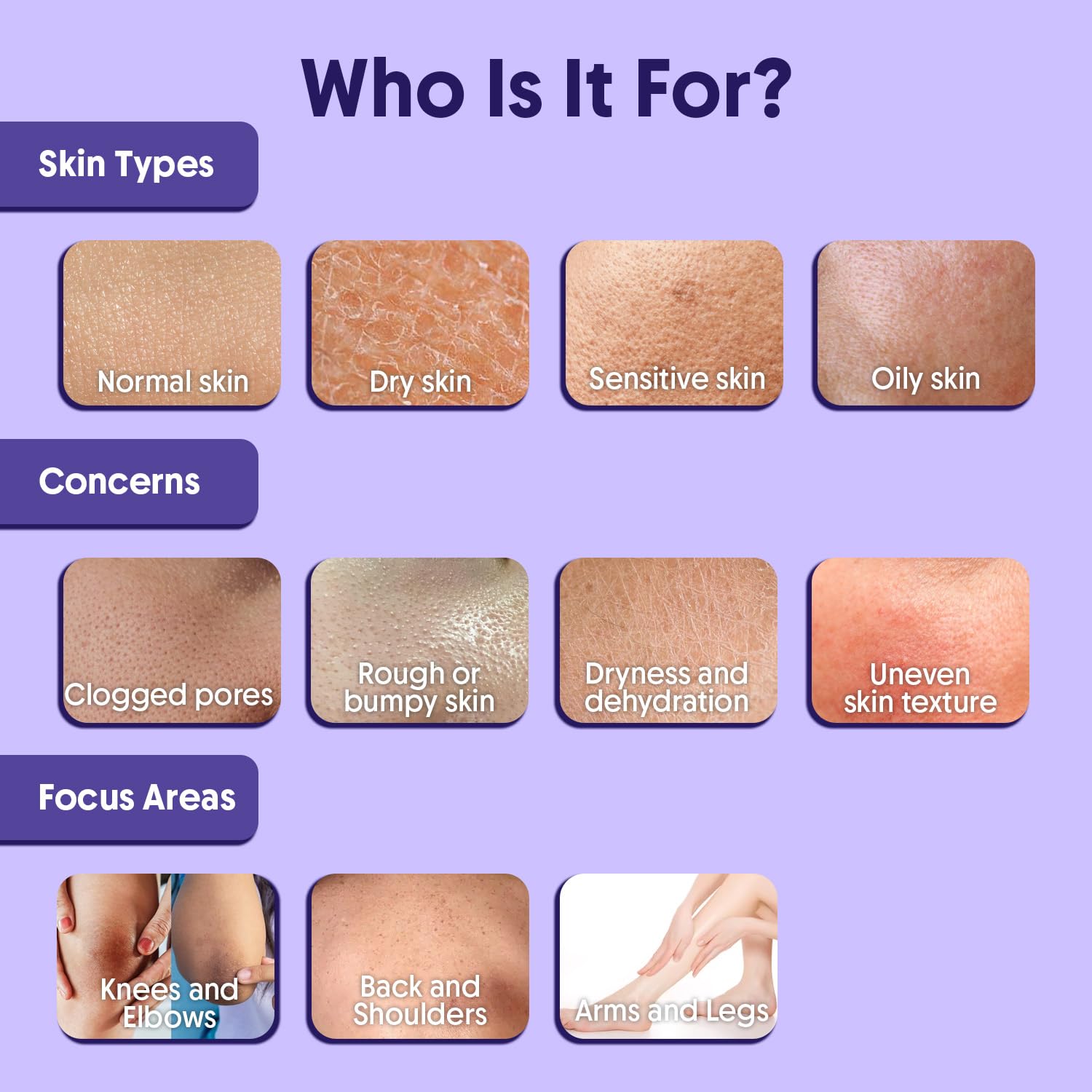 - IMPROVES SKIN TEXTURE: Regular use of an AHA/BHA body lotion can enhance skin texture. AHAs smooth rough patches and reduce the appearance of bumps, while BHAs clear out clogged pores, promoting a more refined texture.