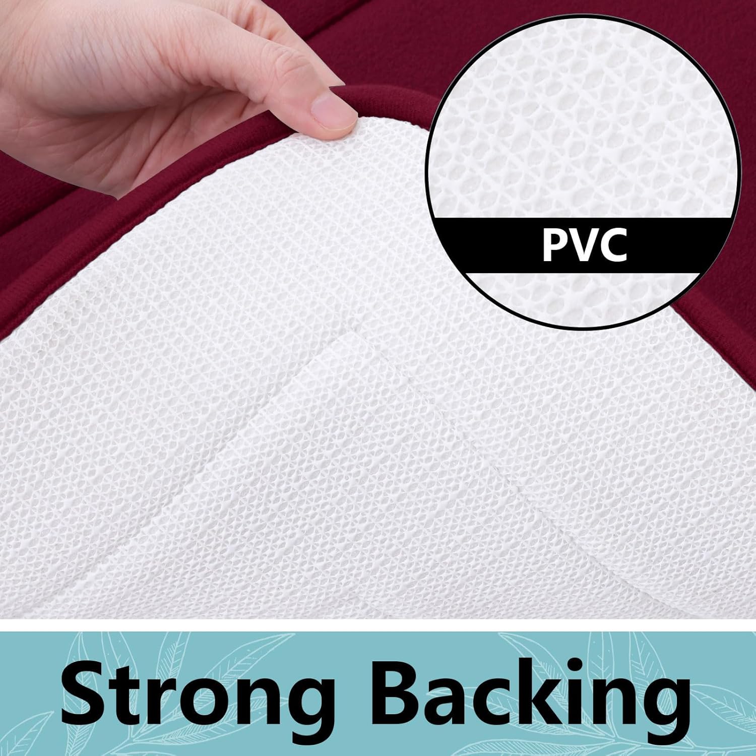 - PVC Backing : Our bath mat features a non-slip backing made from good quality mesh PVC that helps ensure you and your family stay secure. WARNING: Place mat on CLEAN DRY SMOOTH FLOOR only. Water under bath mats can cause it to slip. Keep bottom of mat dry. Before using bath carpet, test with foot to ensure it doesn't move
