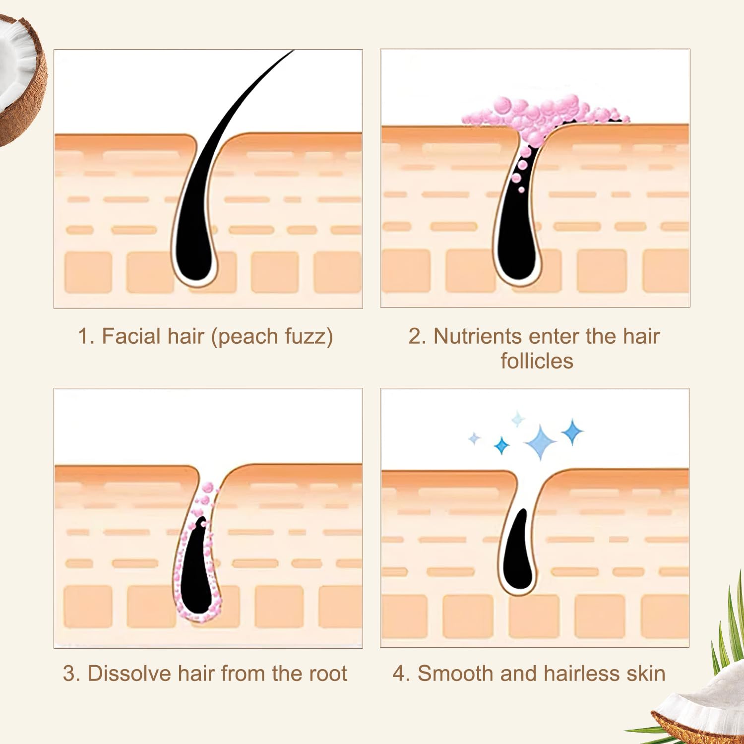 Facial Depilatory Cream, Coconut Hair Remover for Upper Lip and Chin for Face Hair Remover for Body Sensitive Skin Gentle and Non-Irritating,Body Hair Removal Cream for Women(2PCS)