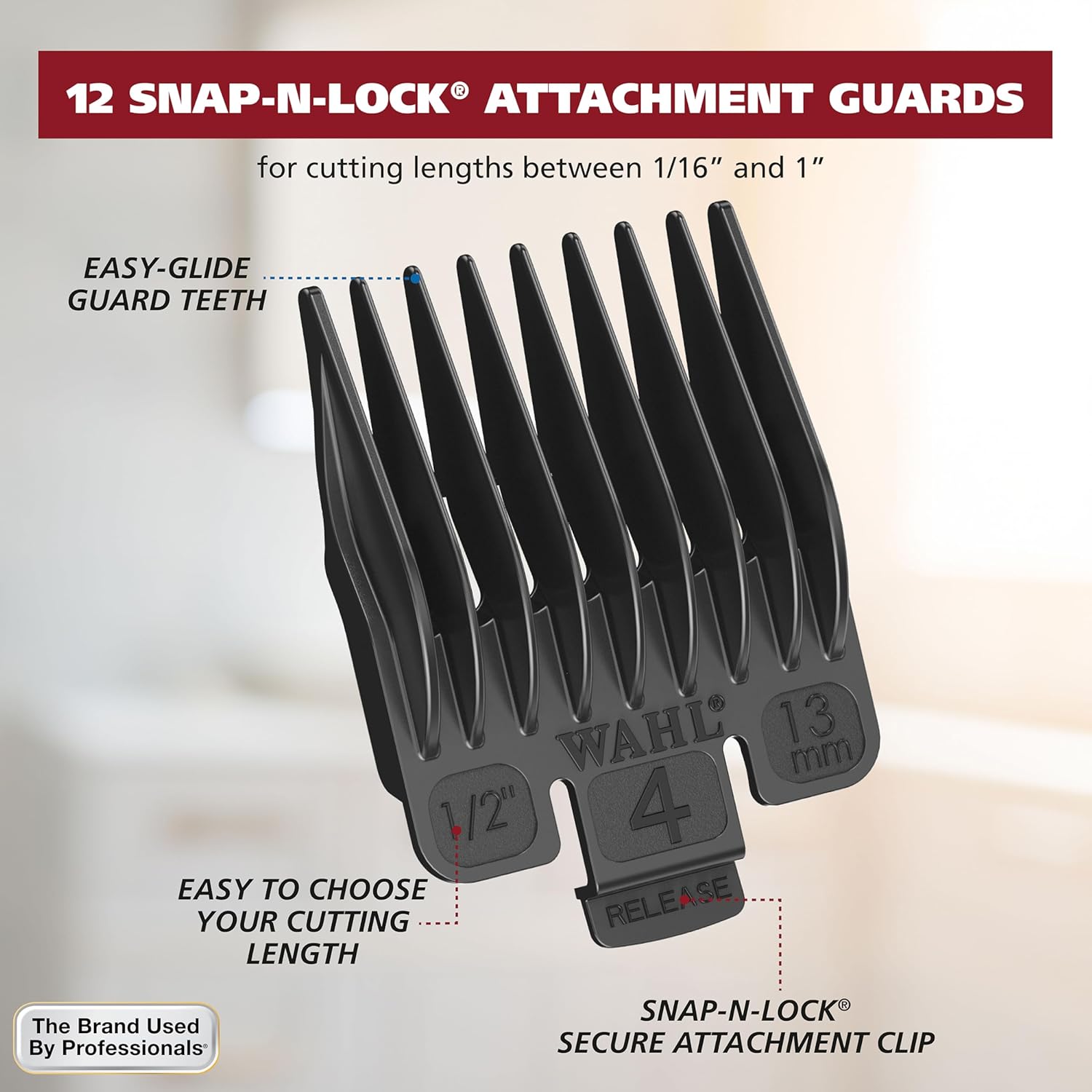 - SNAP-N-Lock Attachment Guards - Kit features 12 smooth cutting hair clipper attachment guards for no-snag, goof proof haircuts ranging in cutting lengths from 1/16” to 1”