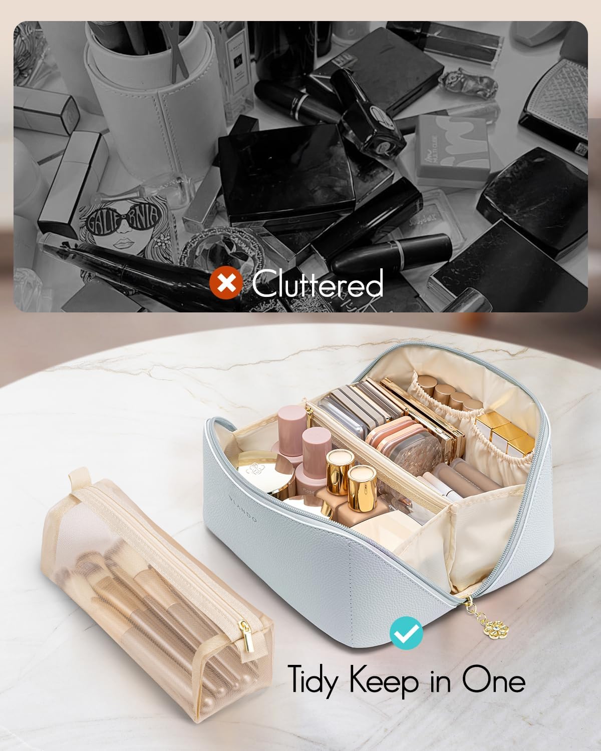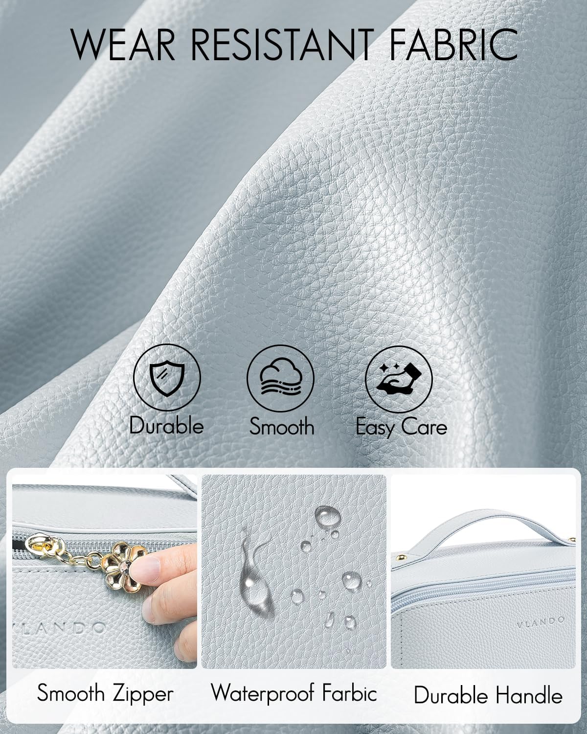Vlando Makeup Bag,Large Capacity Toiletry Bag for Women Waterproof Portable Make up Pouch PU Leather Open Flat Cosmetic Bag(Baby Blue)
