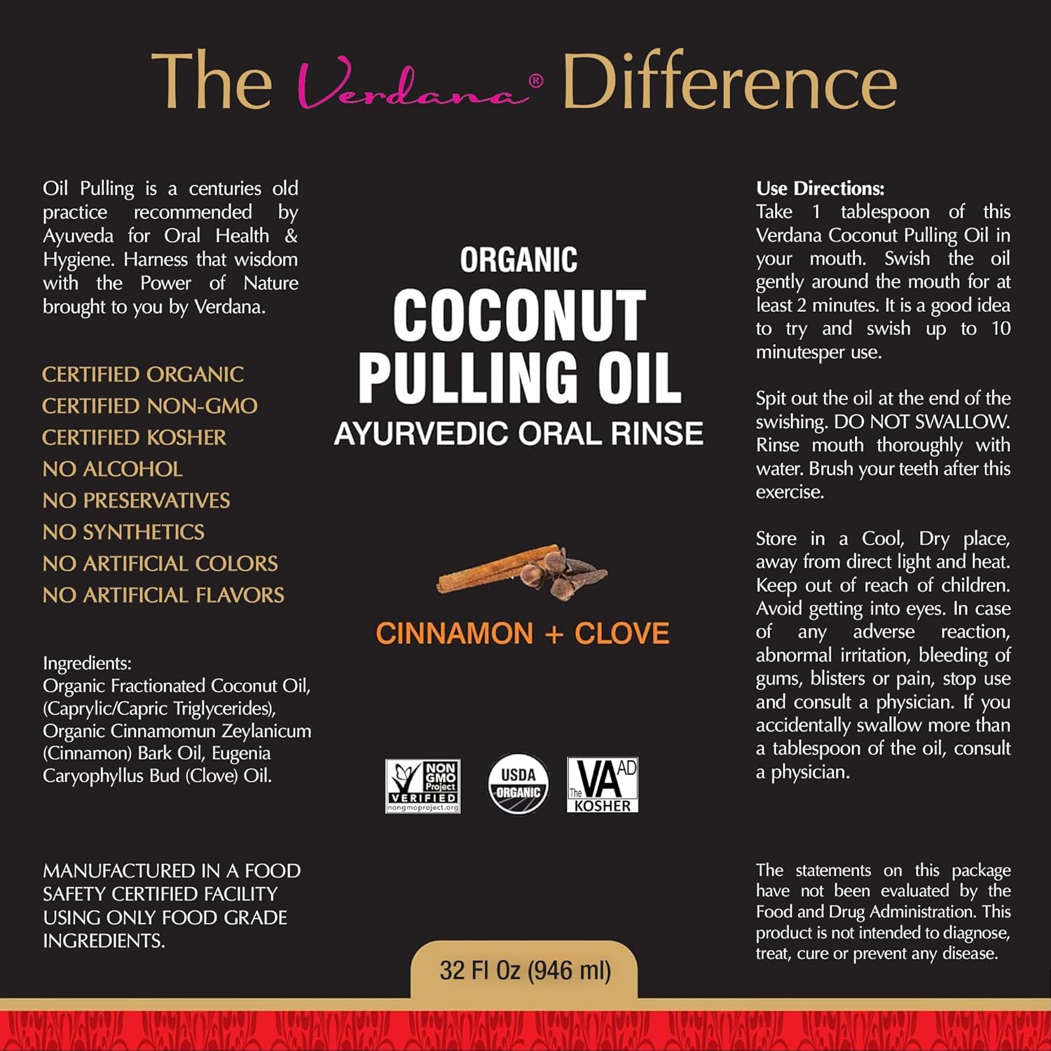 Verdana Organic Oil Pulling Mouthwash – 32 oz Cinnamon & Clove – USDA Organic Coconut Oil Rinse for Teeth & Gums – Alcohol-Free, Fluoride-Free Natural Mouthwash for Fresh Breath & Gum Health