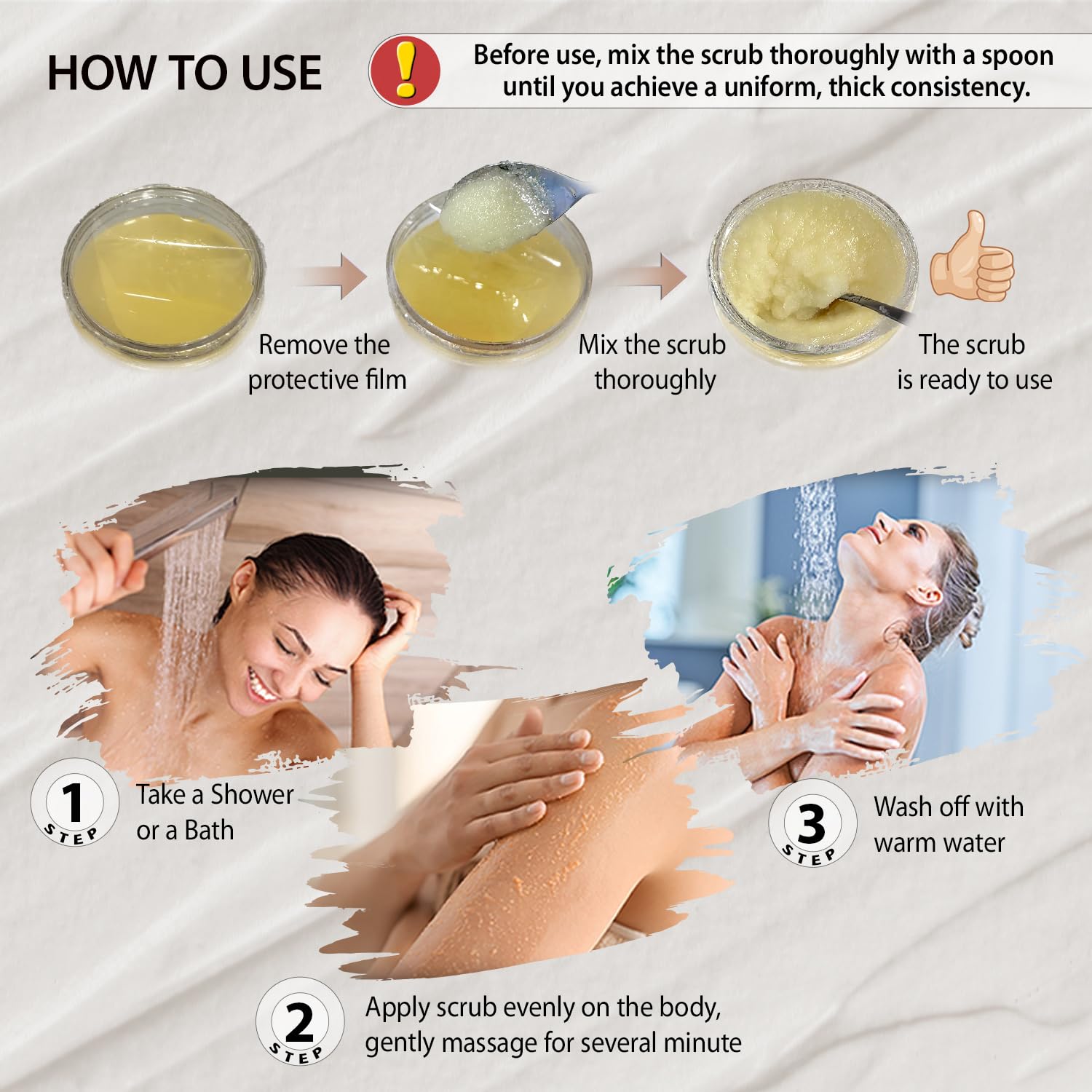 - How to use - before using the scrub, thoroughly mix it to ensure even distribution of the oil and exfoliating particles. Wet your skin with warm water to open the pores, then apply the scrub to damp skin, gently massaging in circular motions. Rinse with warm water and pat your skin dry with a towel. Allow the remaining oil to absorb, avoiding additional moisturizing. This will maximize the effect of the treatment, leaving your skin soft and hydrated.