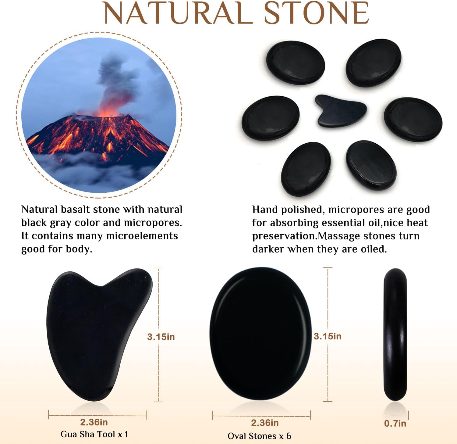 - Hot Rocks Massage Stones Kit: 6 oval working stones (around 3.14 x 2.36 x 0.7 in) and 1 Gua Sha massage stone for face (around 3.14 x 2.2 x 0.23 in). This massage hot stones kit has fantastic heat retaining quality. You can heat them up quickly and enjoy a longer more satisfying massage.
